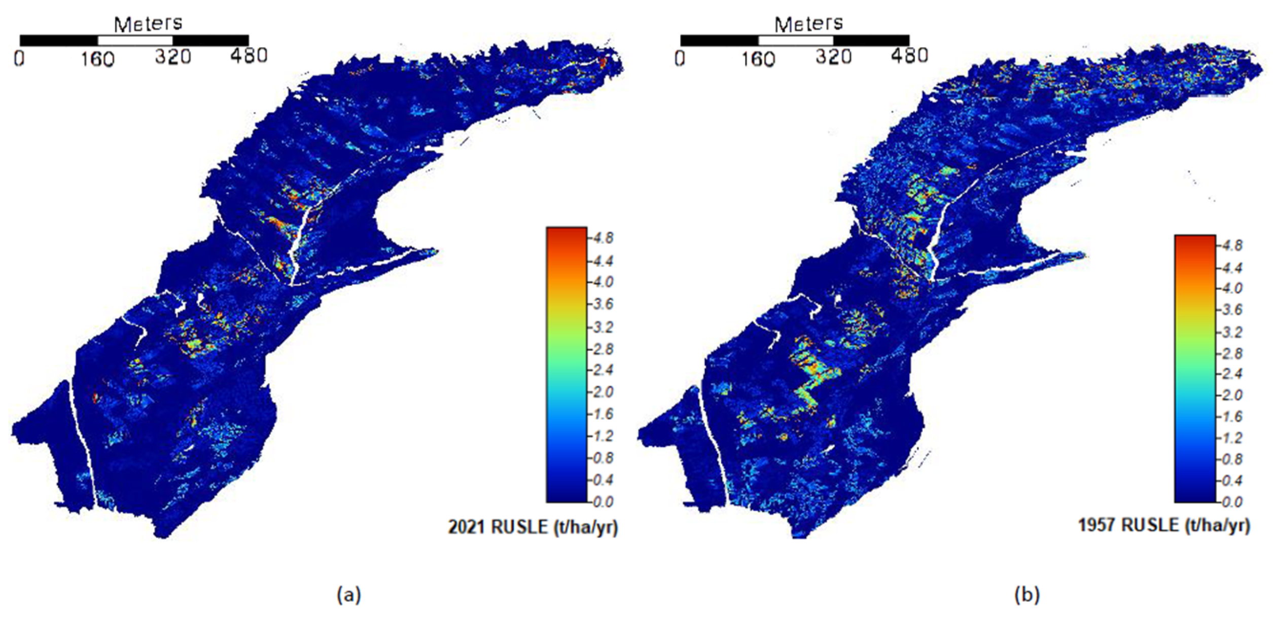 3D RUSLE maps facing landwards. (a) 2021; (b) 1957.