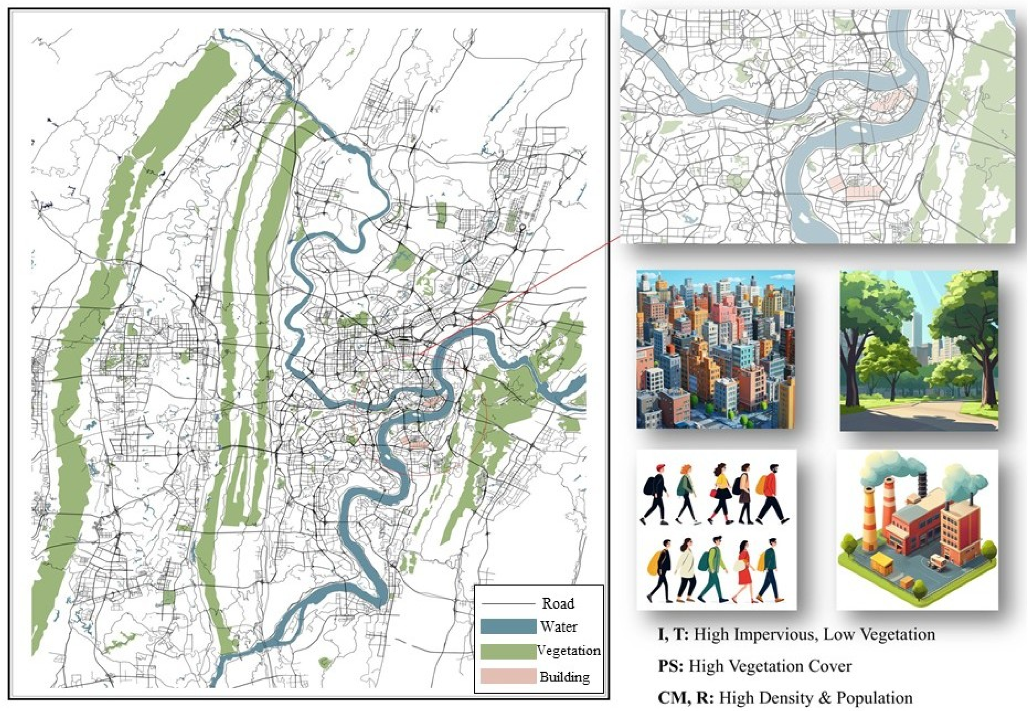 | Public service land (PS) | The place for government and military purpose, educational and research institutions, healthcare and disease preventive facilities, green space and parks, etc. |