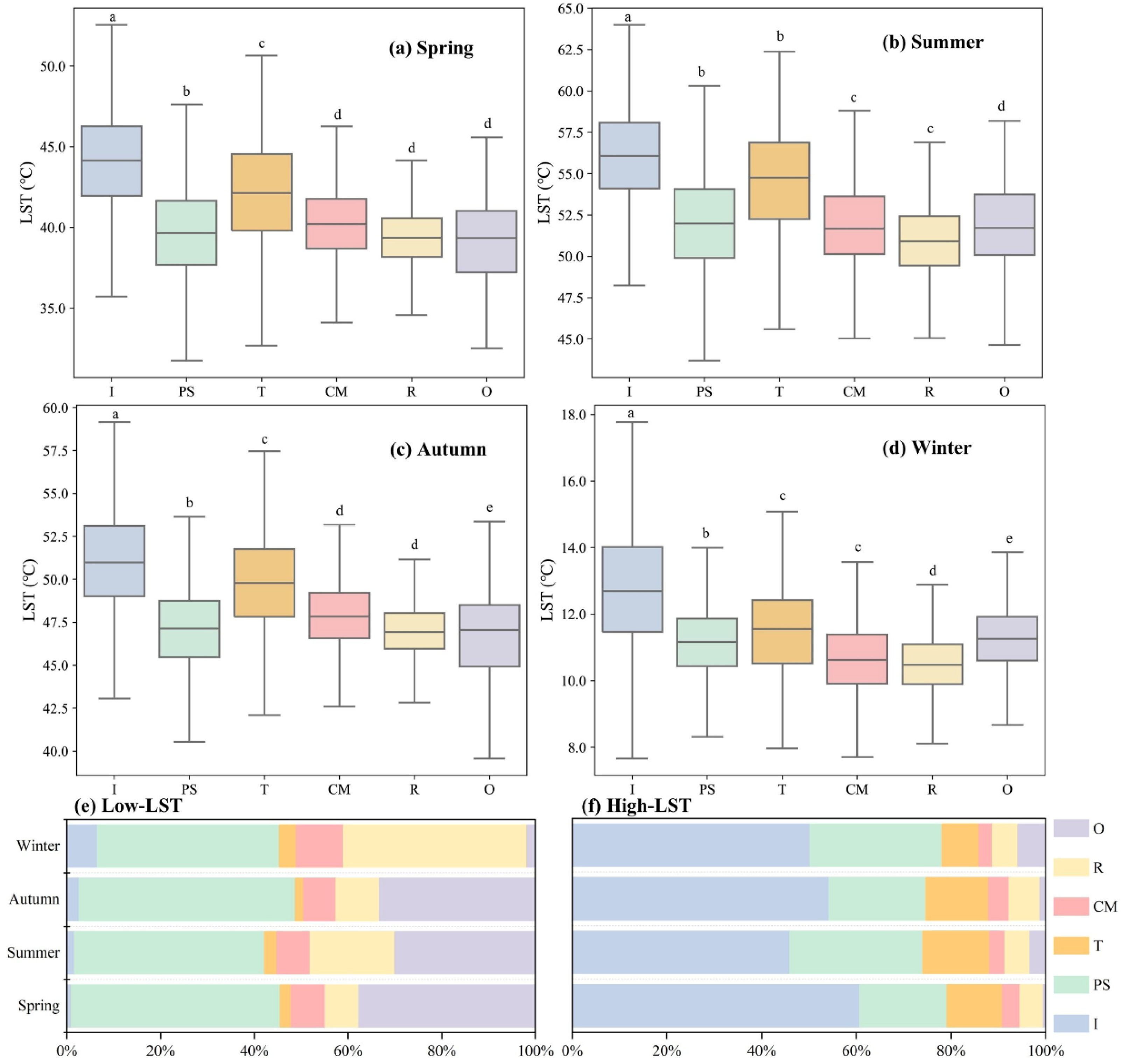4.2. Variations in Seasonal LST Across Different Urban Functional Zones