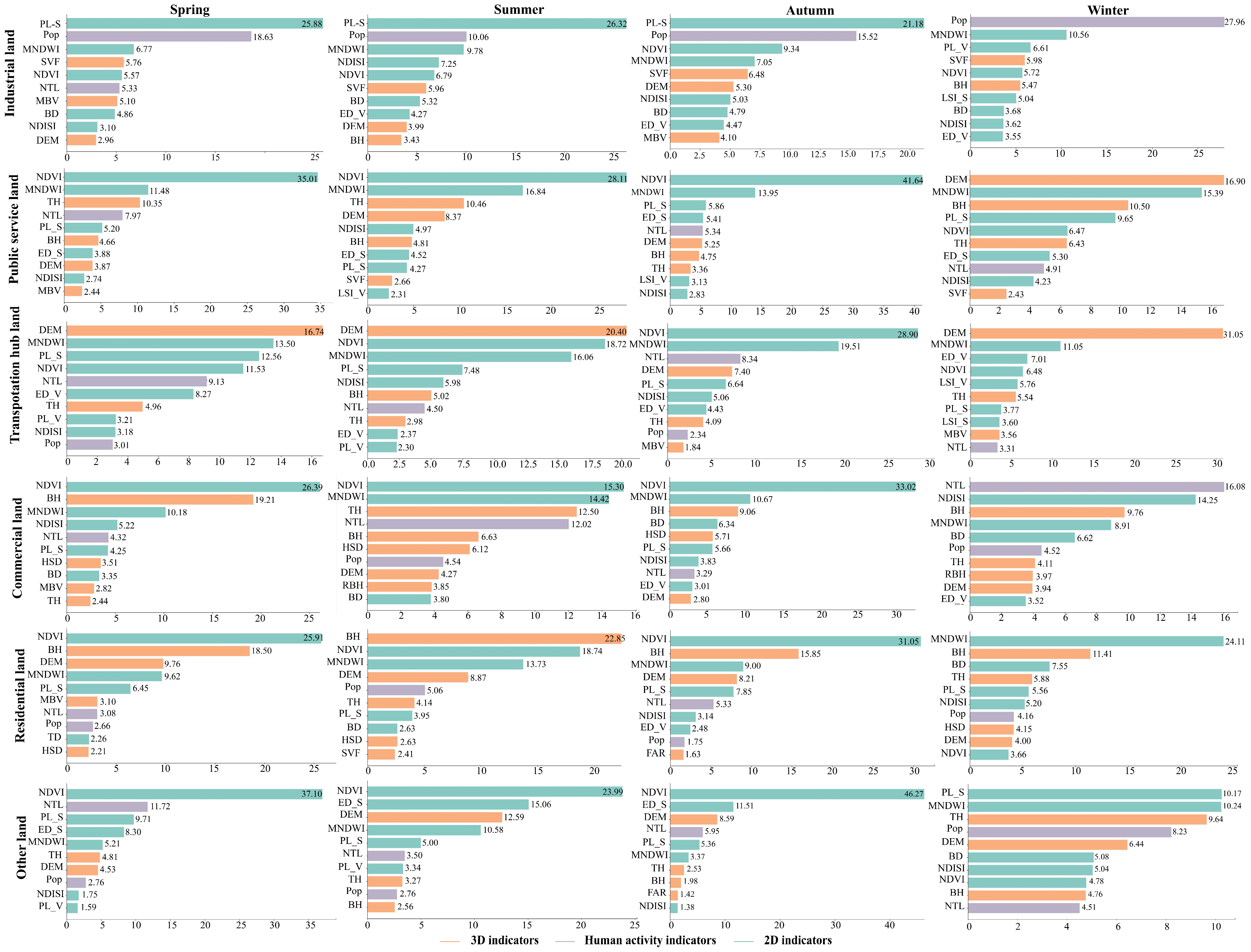4.3. Relative Contribution Analysis of Urban Morphology on Seasonal LST in Diverse Urban Functional Zones