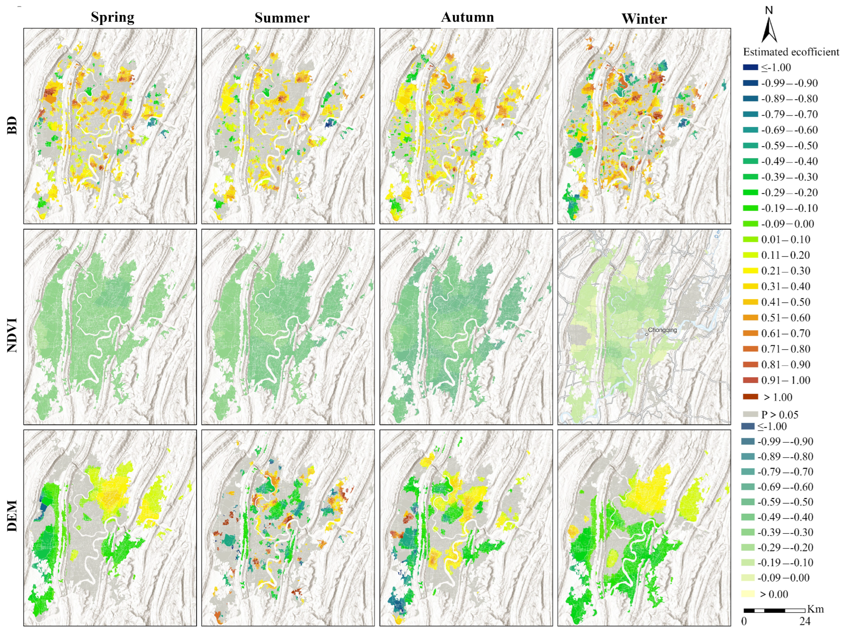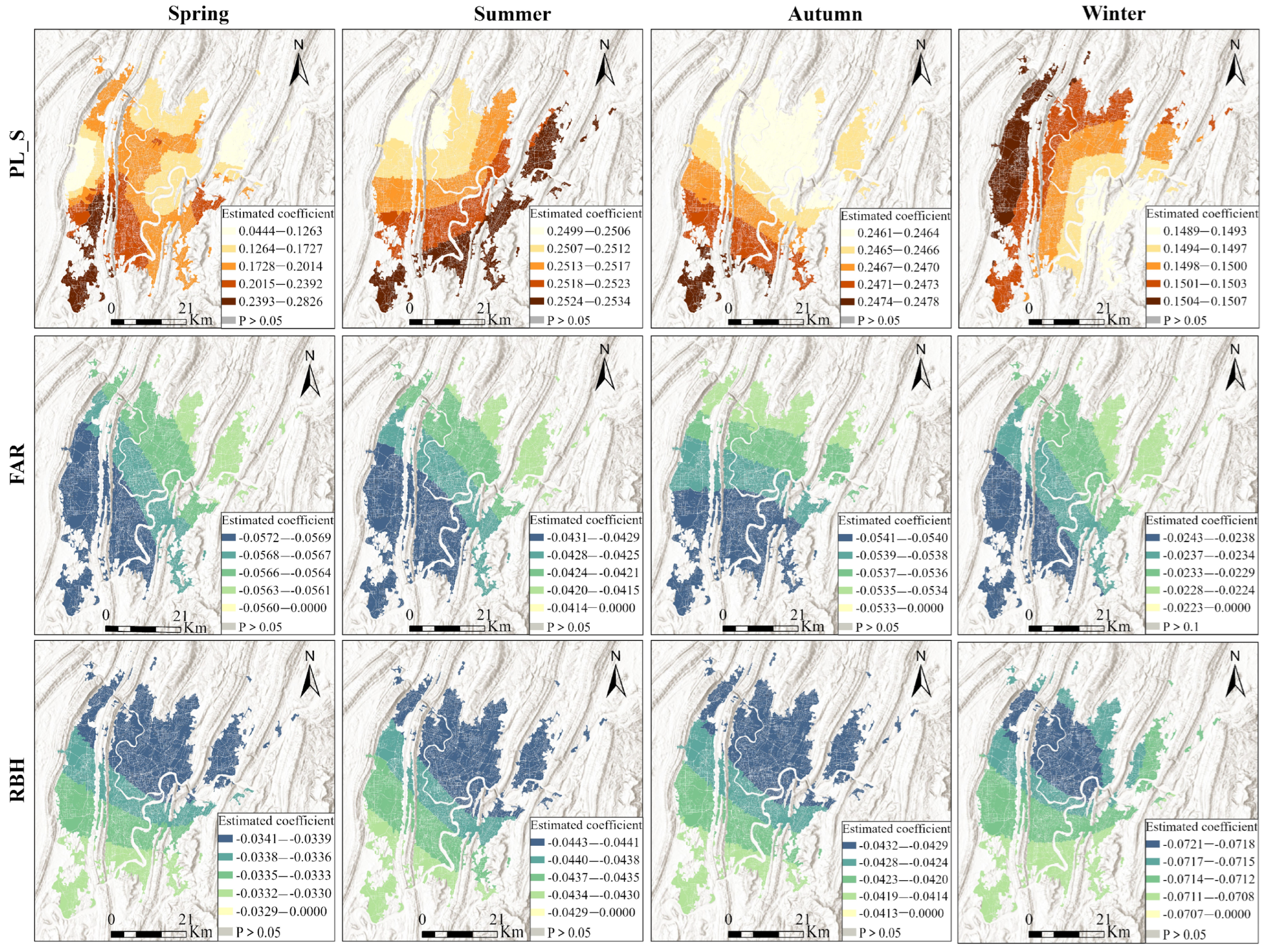 4.4. Spatial Heterogeneity Analysis of the Effects of Urban Morphology on Seasonal LST