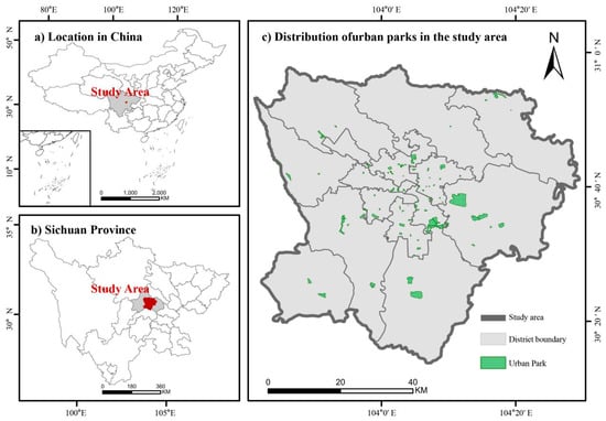 Chengdu (102°54′~104°53′ E, 30°05′~31°26′ N) is located in the central part of Sichuan Province, China (Figure 1), and has a mild climate with four distinct seasons. The study area was the downtown area of Chengdu, including 12 administrative districts and 2 economic functional zones, with a total area of approximately 3639 km2 (Figure 1). With accelerated urbanisation and population agglomeration in Chengdu, the rapidly changing urban environment has posed a considerable challenge to people’s mental health, and thus, Chengdu urgently needs to explore how to manage urban parks to meet residents’ diverse demands for CESs. Furthermore, the Chinese central government has proposed a novel urban development model named “Park City”, which emphasises the integration of green space systems and park networks into urban planning [20]. Such a model aims to enhance the urban ecological environment and improve residents’ quality of life by managing urban parks and has played an increasingly important role in Chinese urban planning. In 2022, the State Council of China approved Chengdu’s plan to establish the first Park City Demonstration Area in China [21], and thus, Chengdu is a representative study area for studying urban parks’ CESs.