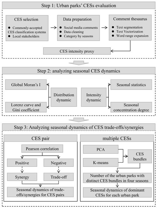 This research was conducted in the following steps (Figure 2). In step 1, we selected typical CESs based on CES classification systems and local stakeholders’ experiences. Then we processed data by collecting social media comments, data cleaning, and seasonal counts. After that, we constructed a comment thesaurus reflecting CESs and used the CES intensity proxy to evaluate different CESs. In step 2, Global Moran’s I, Lorenz curve, and Gini coefficient were used to reveal CES distribution dynamics, and seasonal statistics and seasonal concentration degree were used to analyse CES intensity dynamics. In step 3, we analysed CES trade-offs/synergies and their seasonal dynamics for CES pairs and multiple CESs, respectively. Pearson correlation was used to reveal the trade-offs/synergies of CES pairs, and CES bundles were employed to analyse the trade-offs/synergies among multiple CESs. Each analysis technology is detailed in the following subsections.