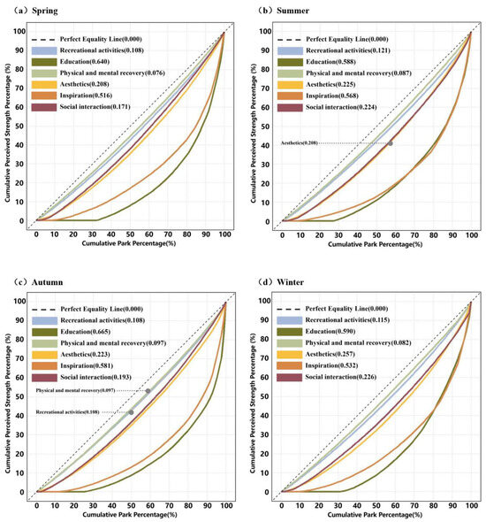 Lorentz curve and Gini coefficients of the intensities of six CESs of urban parks in four seasons.