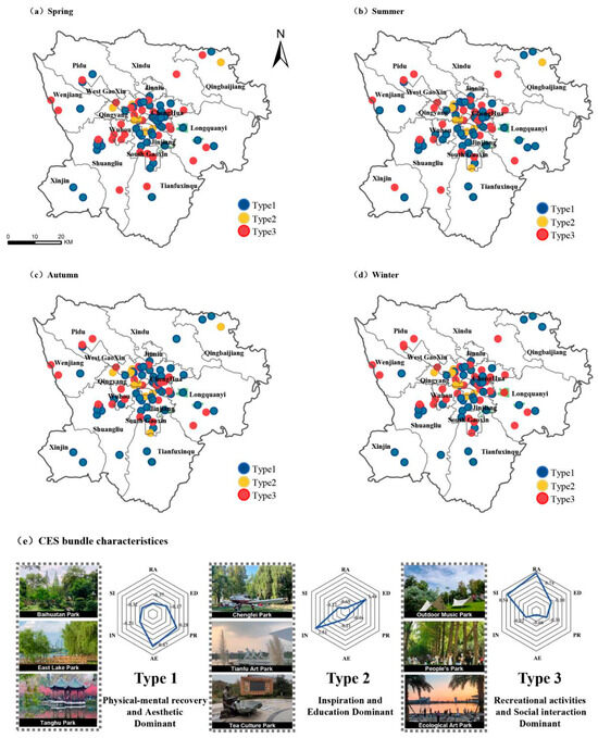 Spatial distributions and characteristics of CES bundles in different seasons. RA: recreational activities; ED: education; PR: physical and mental recovery; AE: aesthetics; IN: inspiration; SI: social interaction.