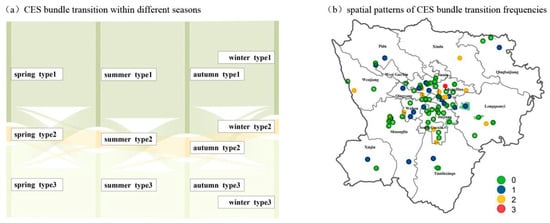 Figure 7 illustrates how the park’s CES bundle changes with seasons. Urban parks may exhibit different CES bundle types in different seasons. The transformation between the physical and mental recovery- and aesthetics-dominated bundle and the social interaction- and recreation-dominated bundle was the most significant. For example, from spring to summer, the CES bundle type of nine parks switched from the social interaction- and recreation-dominated bundle to the physical and mental recovery- and aesthetics-dominant bundle. The parks with the inspiration- and education-orientated bundle were relatively stable, indicating that the dominant CES types of the parks with this bundle type were less affected by seasonal variations. The CES bundle change times for each park were recorded due to the season variation (Figure 7). More than half of the urban parks showed no change in their bundle type (transition frequency = 0), indicating high seasonal stability in the CES composition of many parks. The parks with a CES bundle change frequency of 1 were distributed in the core area of the central urban area, Southern Pidu District, Southern Shuangliu District, Northern Qingbaijiang District, and Central Tianfu New District. The parks with a CES bundle change frequency of 2 were mainly distributed in the core area of the downtown area and west of Wenjiang District, south of Xindu District, and south of Longquanyi District. The only park that exhibited CES bundle change frequency of 3 was the Seaside Park, which was newly built in the central area.