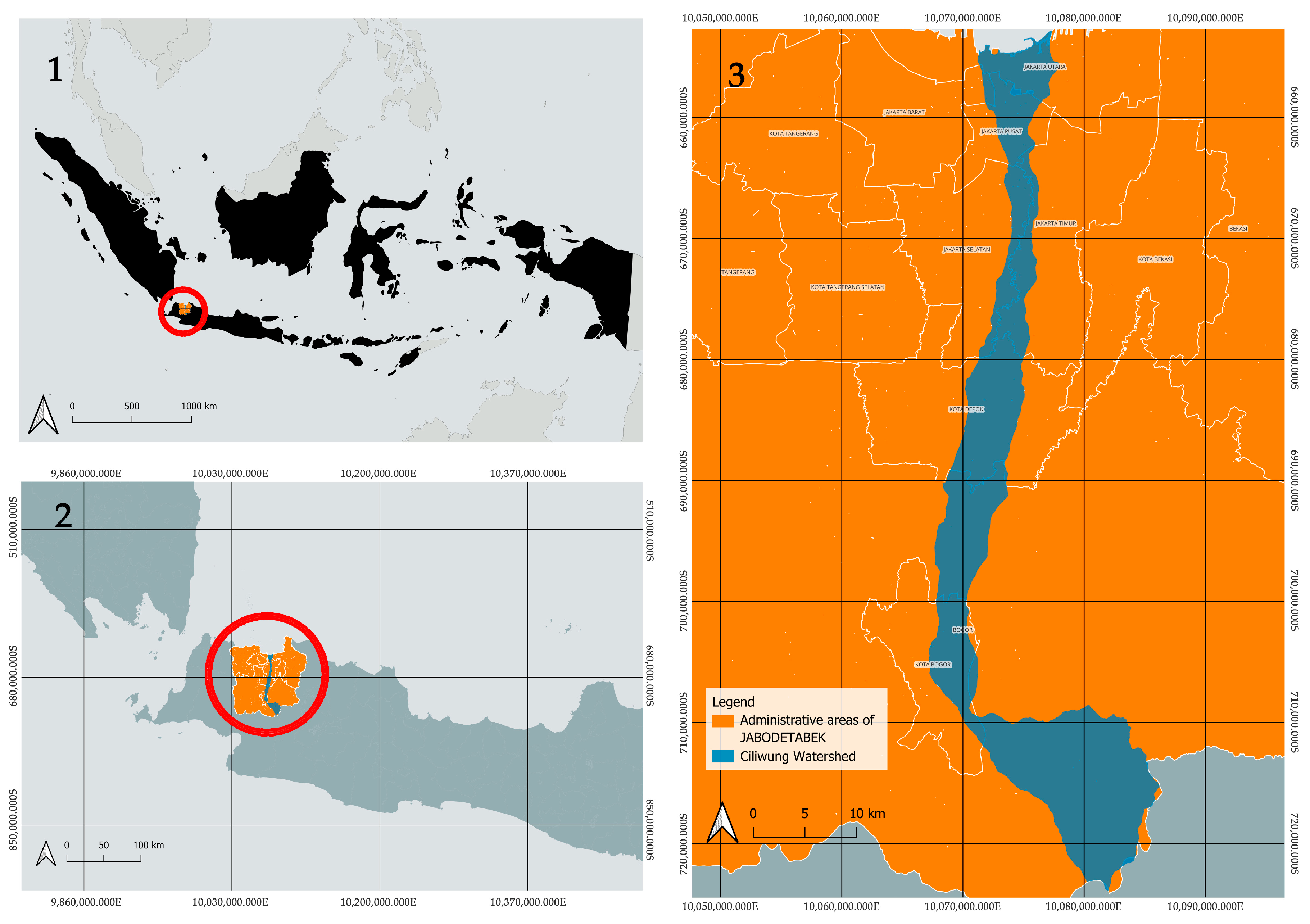 Figure 1. Map of Indonesia (1); Map of Jakarta–Bogor–Depok–Tangerang–Bekasi (Jabodetabek) (2); Map of Ciliwung watershed (3). The red circle shows the location of the study area.