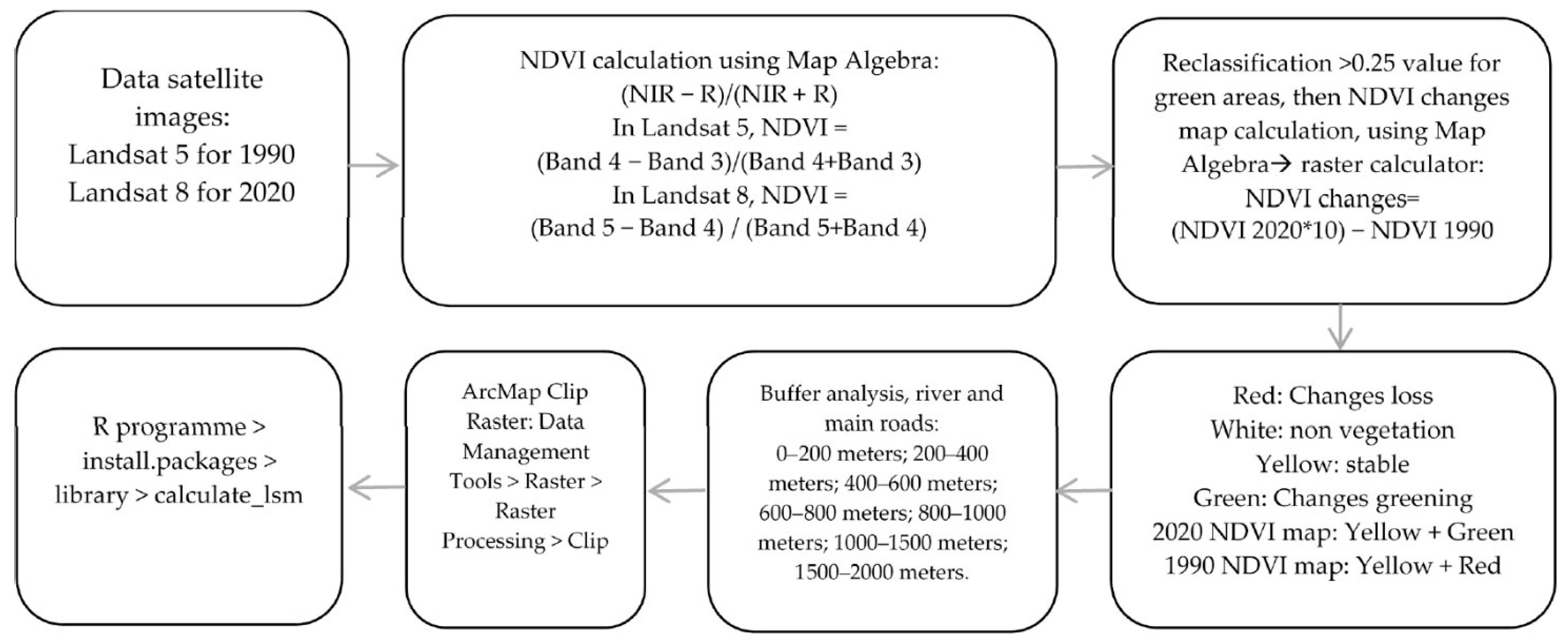 Further details of the process are explained later in Section 2.2.1 for the NDVI calculation methodology and Section 2.2.2 for the buffer analysis and metrics calculation.