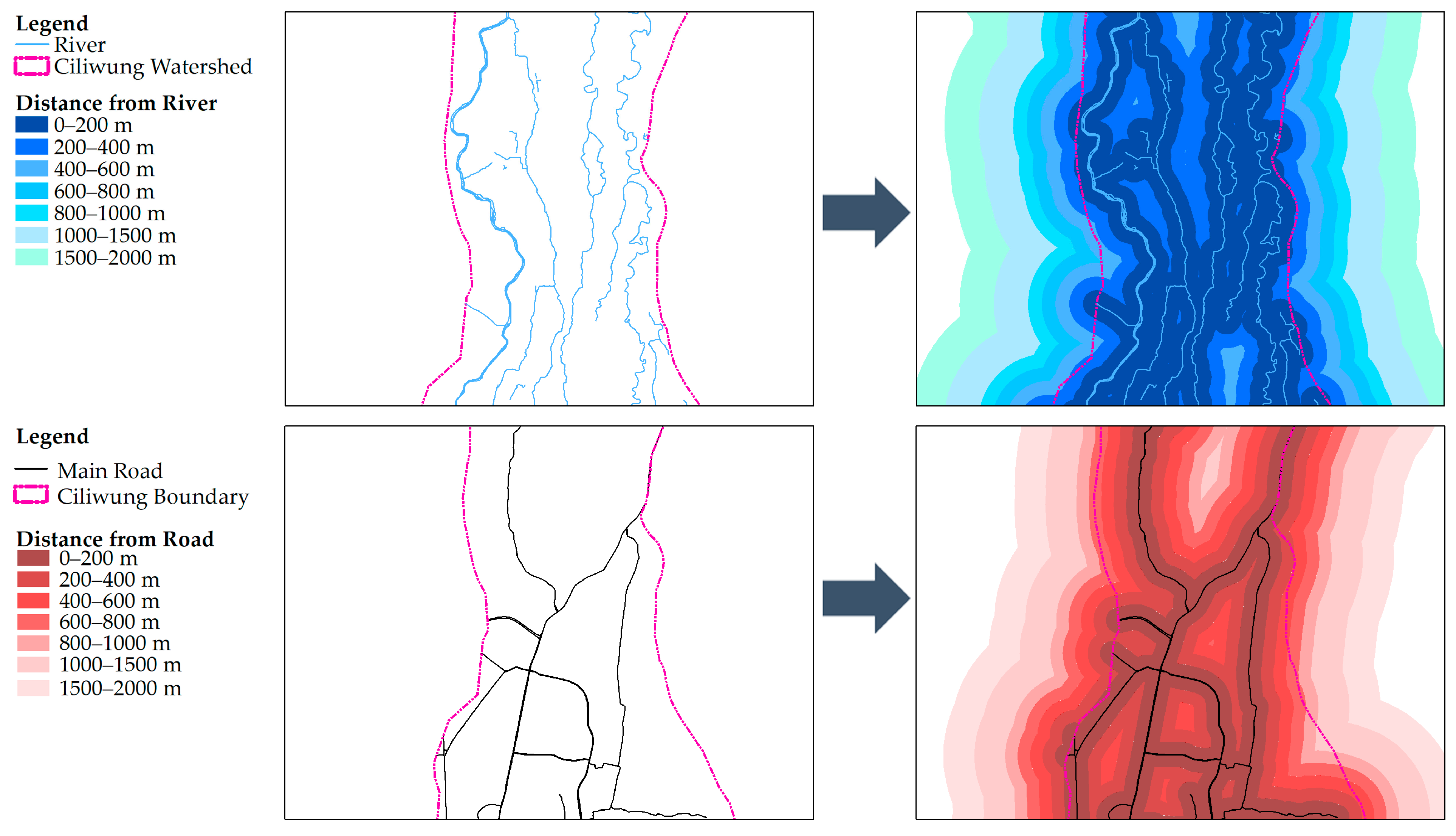 Figure 3. Buffer analysis: for the river (top) and main roads (bottom) showing original input (left) and buffered output (right). The arrows illustrate the derivation of buffer zones from the primary river and main road networks.