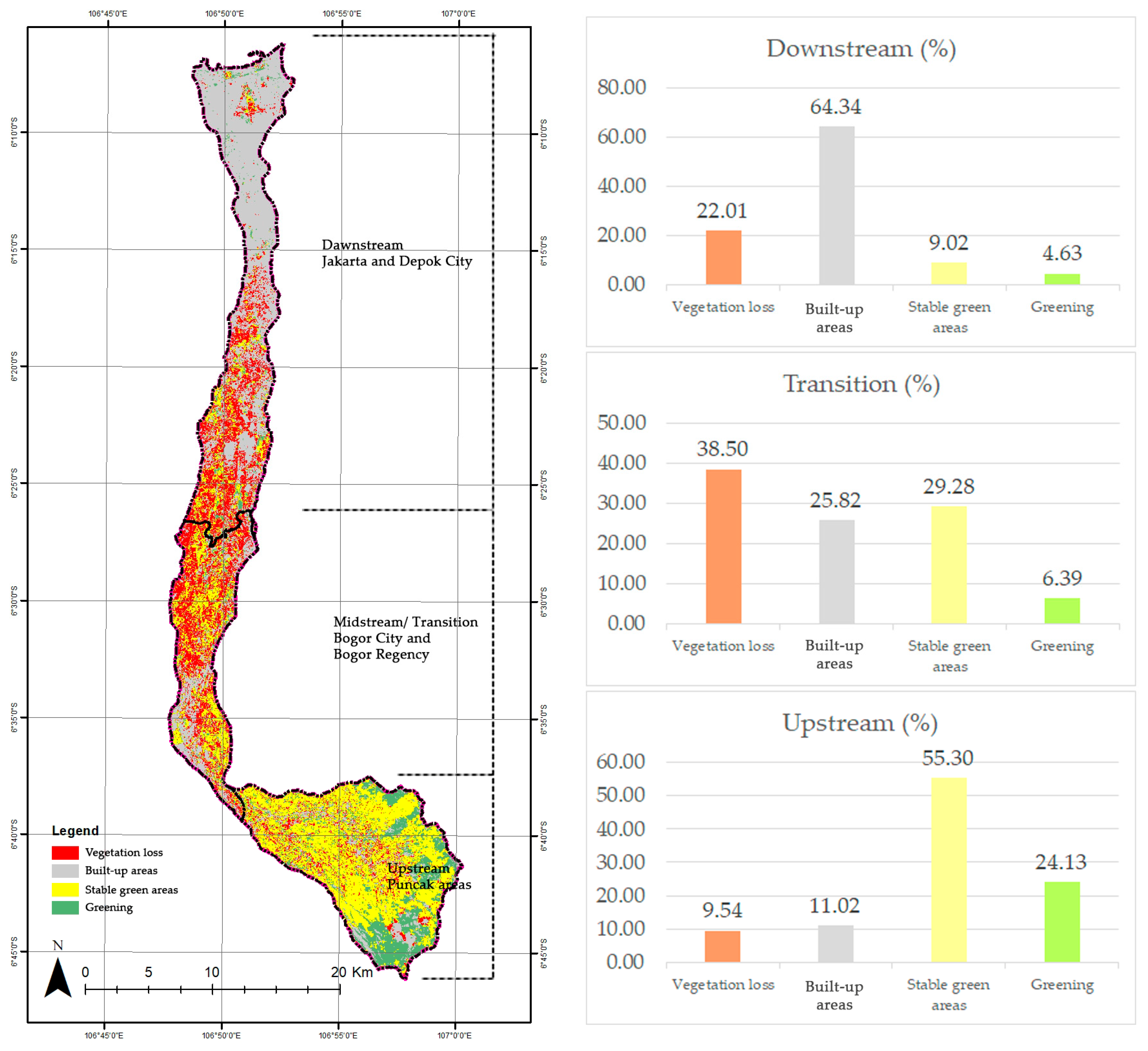 The NDVI calculations (Figure 5) found significant fragmentation changes in transitional areas, accounting for 38% of the watershed, which includes Bogor City and Bogor Regency. Non-green spaces, mostly located in the downstream areas around the capital city Jakarta and Depok City, were less fragmented and accounted for approximately 64% of the total watershed area. In the upstream area, stable conditions prevailed, covering around 55% of the total watershed, primarily linked to plantation areas. However, there was also considerable greening in upstream areas, which constitute about 24% of the watershed (Figure 5).