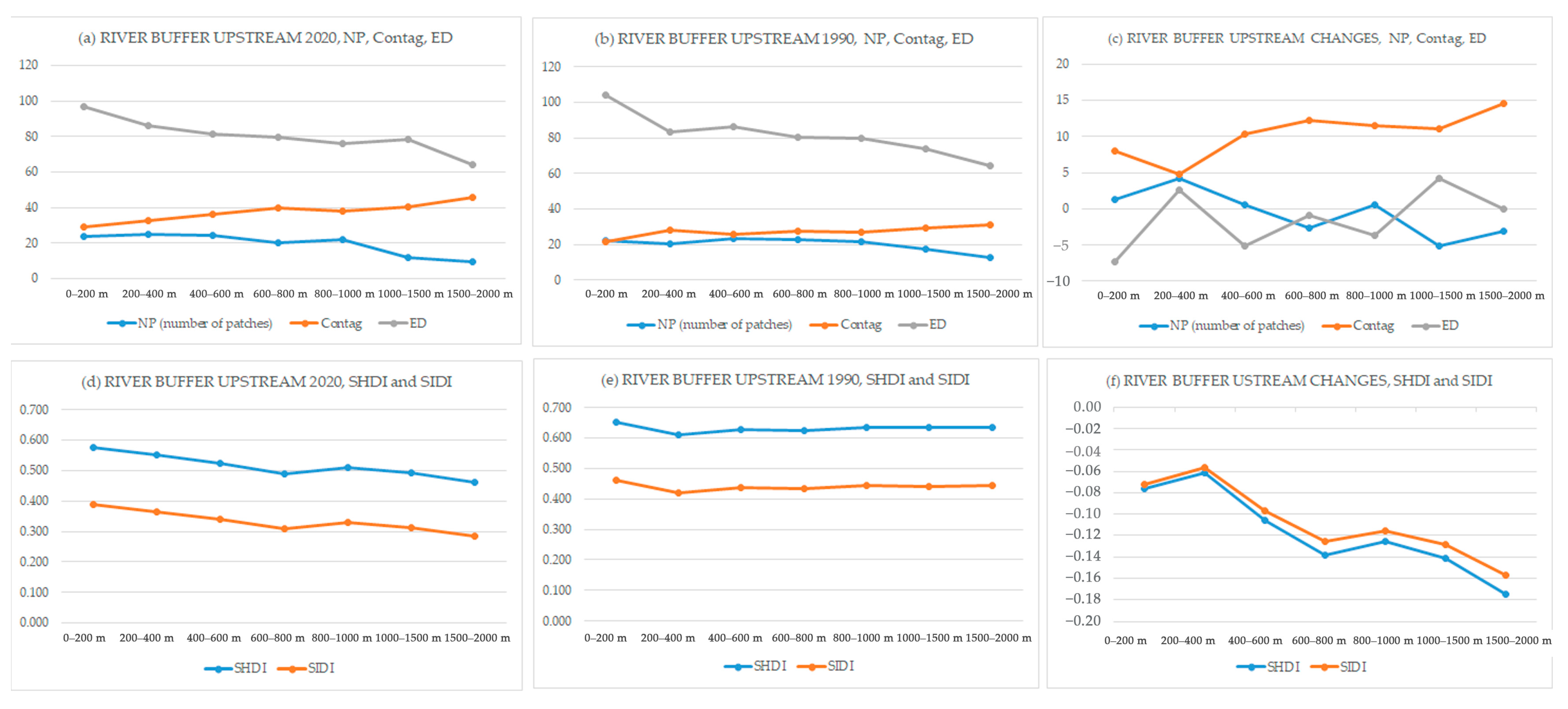 In the upstream area, the NP was high in the 0 to 600 m river buffer in both 1990 and 2020, with the greatest change occurring within the 200–400 m zone. The high ED in this area indicates low connectivity. Additionally, the diversity index showed a decline in the 200–400 m buffer in 1990, and a more consistent decrease with distance from the river in 2020.