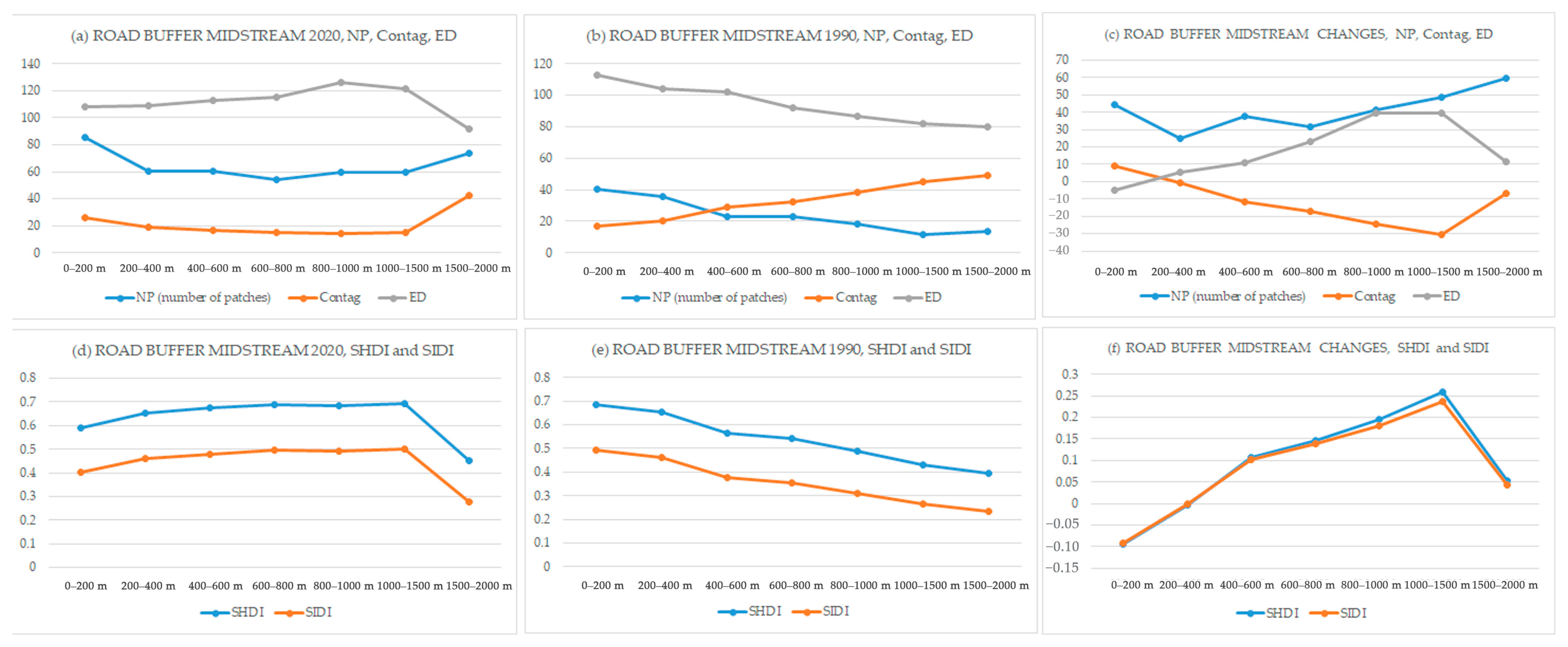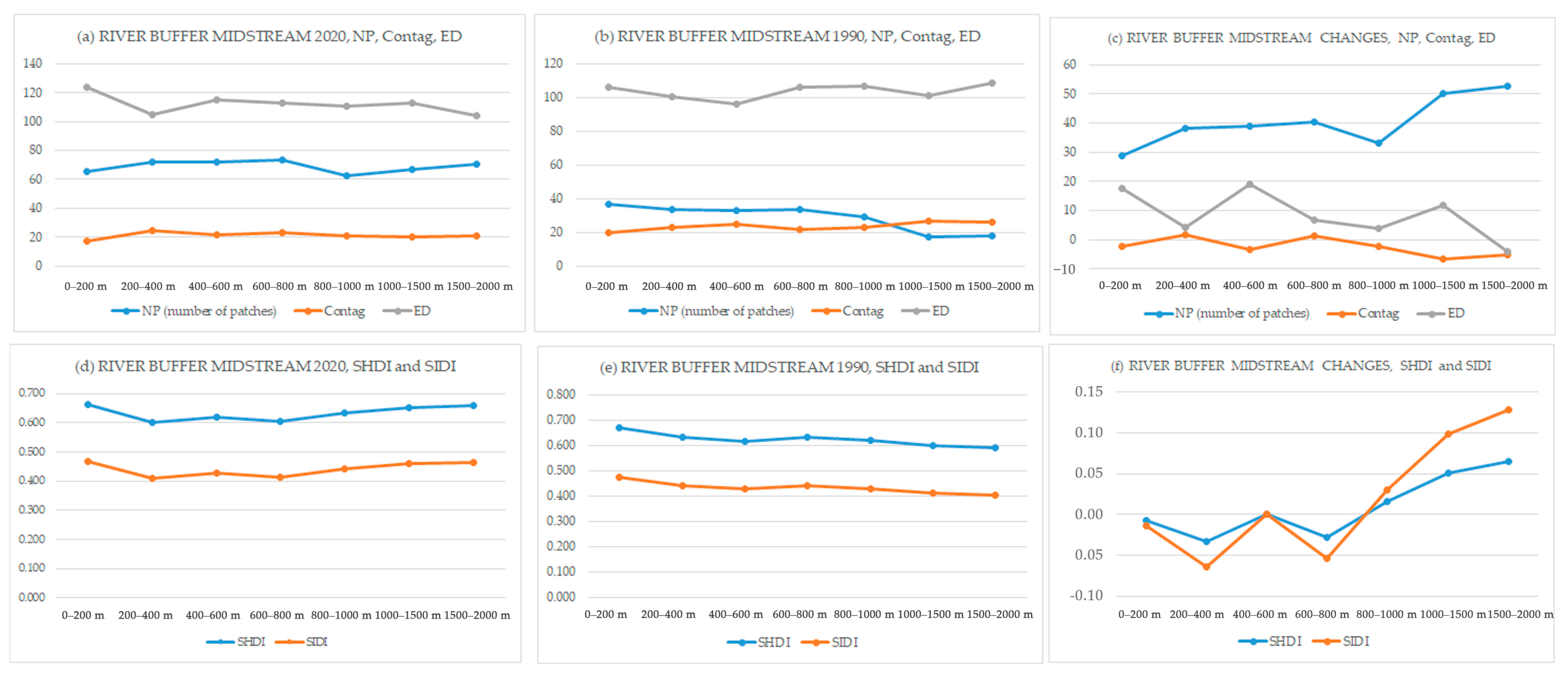 In terms of diversity indices, the SHDI and SIDI show similar patterns. In 1990, there was no significant difference in diversity across the buffer zones, except for a drop within the 200–400 m buffer. However, in 2020, diversity consistently decreased from the 200 m to the 2000 m buffer zones (see Figure 6d,e). This decline is most pronounced in the change data, which shows a significant drop in both SHDI and SIDI from areas near the river to those furthest away, meaning there was a decline in diversity from 1990 to 2020 (see Figure 6f). The highest change in diversity occurred in the 200–400 m zone, correlating with the highest change in NP in this area.