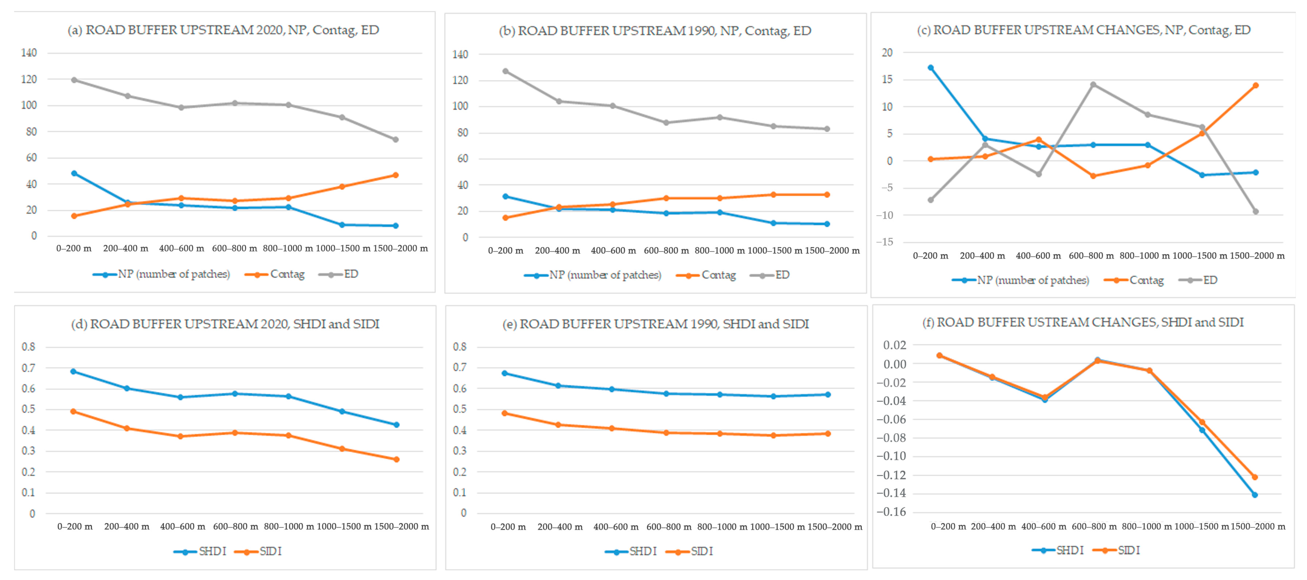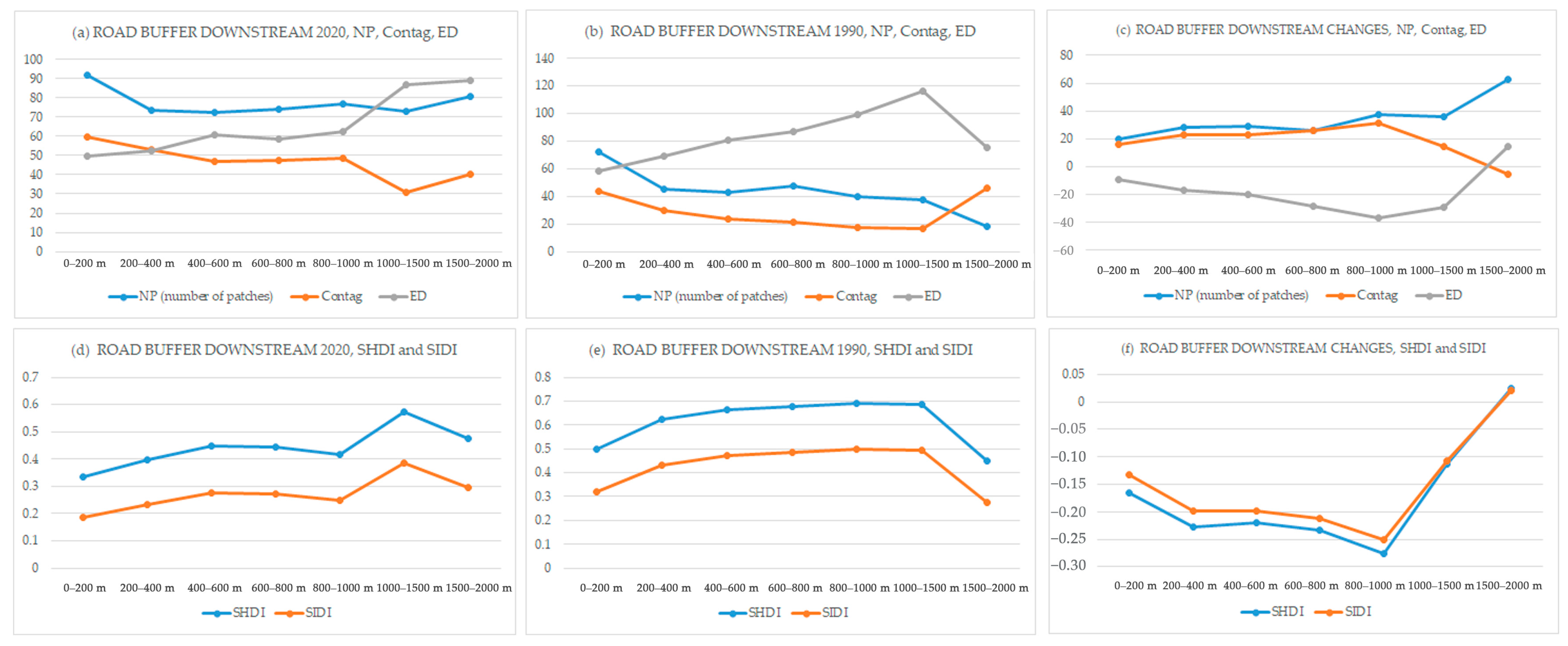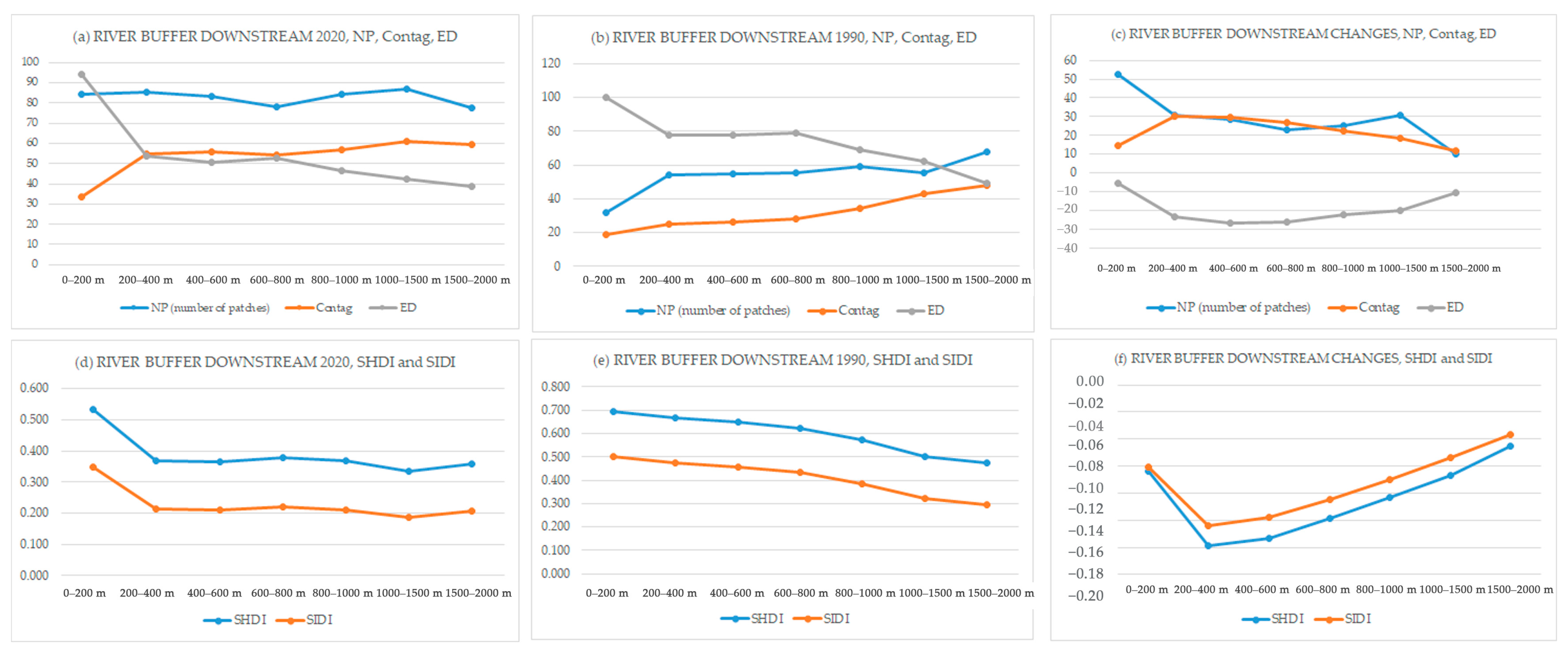 However, in the downstream area, the area nearest to the river under a 200 m buffer experienced the most significant change in NP over the past 30 years. In both 1990 and 2020, this area showed low connectivity and a high degree of patchiness, evidenced by a low Contag and a high ED. Furthermore, all diversity indices across all buffer zones showed negative values, indicating an overall decrease in diversity from 1990 to 2020.
