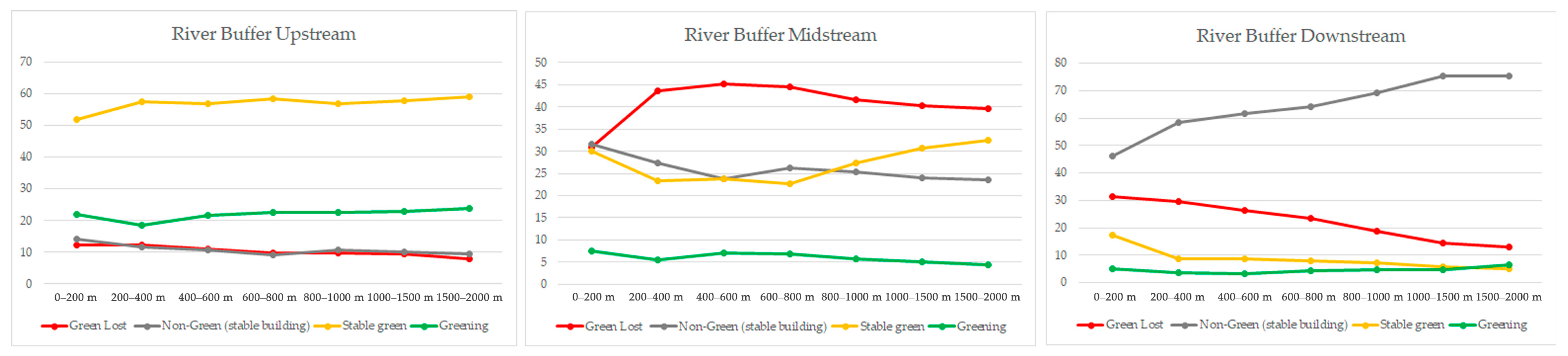 Buffer analysis based on NDVI changes reveals that fragmentation changes occur differently among the upstream, midstream, and downstream sections of the river. As shown in Table 1, for the upstream river buffer, green loss occurs most significantly in the under 200 m and 200–400 m buffers, with both having 12% of the buffer recorded as areas of green loss compared to a gradual decrease to 8% green loss coverage as the distance from the river increases to 2000 m. The amount of loss within the midstream was much greater than upstream and with a different geography. Here, in the midstream, green loss is highest within the 400–600 m buffer at 45% of the buffer area. Conversely, the lowest green loss in the midstream is found in the 200 m buffer, at 31%. Downstream, the trend is similar to upstream, with green loss being most pronounced near the river (32% at 200 m) and then decreasing with distance. Overall, the highest rate of building change across all segments is downstream within the 1000–2000 m buffer, reaching 75%. This suggests that while green loss occurs highly in the midstream of the Ciliwung River, green areas still remain very close to the river in this segment (30% stable green at 200 m).