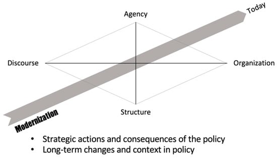 Among the policy analysis theories inspired by neo-institutionalism is the policy arrangement approach (PAA). Policy arrangement is defined as “temporary stabilization of the content and organization of a specific policy area” [47]. According to this concept, policy research does not (1) explain routine and temporary policy processes but analyzes mid- to long-term changes and patterns of stable institutions. (2) In most cases, the approach is described and characterized from a comparative perspective. (3) The approach interprets the mechanism behind relative safety or change and the dynamics of the mechanism. Through this, (4) the policy process is examined from an institutional perspective, and the definition is applied to practical and organizational aspects. (5) Considering the long-term perspective of specifying modern society, it is initially captured as a comprehensive concept of ‘modernization’.
