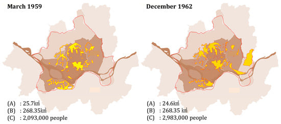 According to Article 245 of the Civil Law at the time, “The period of acquisition of real estate ownership due to occupancy”, the occupant could own the land if the period of unauthorized occupancy was more than 20 years. Under this law, urban planning sites, including parks and private land whose owners were unknown, were in the hands of illegal building occupants. Therefore, in order to solve Seoul’s overpopulation and housing shortage, Mayor Kim Hyun-ok fostered unauthorized housing (substandard housing) while supplying a large number of civic apartments. The former will be discussed in detail in the next section, but the latter was also closely intertwined with park management and maintenance. In 1968, the Seoul Metropolitan Government cultivated 1.34 km2 of unauthorized housing areas and 44,493 buildings. Among them, unlicensed houses equivalent to 0.73 km2 (51.9%) and 17,478 buildings (39.3%) were distributed in the park [The Masterplan of Seoul Urban Planning Park, 1968]. Eungbong Park (149,327 m2/1,204,408 m2) was the most encroached, and so were Changgyeong Park (2460 m2/183,300 m2), which was part of a palace cultural artifact, and Sajik Park (63,210 m2/192,400 m2).