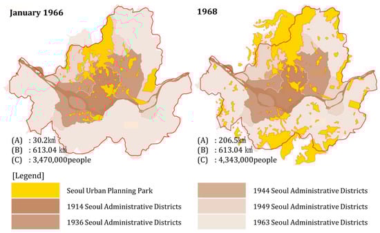 Changes in Seoul’s Urban Planning Park in the 1960s. [A] is the park area. [B] is the area of Seoul. [C] is the population of Seoul. Source: It was reconstructed by the author with reference to the following literature. Seoul Statistical Yearbook, 1961–1970 (research report to Seoul Metropolitan). Seoul Urban Planning Book, 1965 (research report to Seoul Metropolitan). The Masterplan of Seoul Urban Planning Park, 1968 (research report to Seoul Metropolitan).