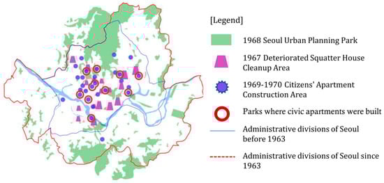 Location of Seoul Urban Planning Park where citizens’ apartments were built. Source: It was reconstructed by the author with reference to the following literature. Survey Report of Substandard Housing, 1965 (research report to Seoul Metropolitan Urban Planning Commission). Citizen apartment Construction Master Plan, 28 February 1969 (official document of Seoul Metropolitan: No. 770-366). The City is A Line: Mayor Kim Hyeon-Ok. 2016 (brochure to Seoul Museum of History) [55]. The Masterplan of Seoul Urban Planning Park, 1968 (research report to Seoul Metropolitan).