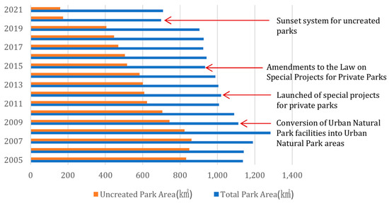 Due to the government’s active action, the area of uncreated parks has shifted to a decline since 2008, and there was a decline of 455 km2 of unconstructed park area in the park status statistics until 2019, the year before the sunset clause was implemented. In July 2020, the sunset clause was implemented for uncreated parks, which was an area equivalent to 368 km2. According to the latest statistics in 2021, only 158 km2 of the park area had not been built for less than 10 years (Figure 5).