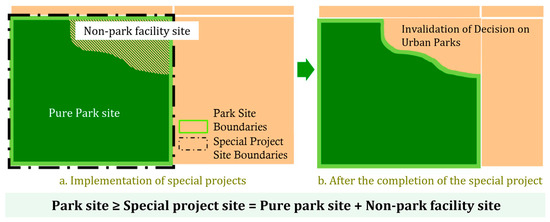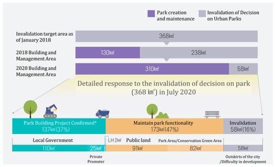 In 2014, the Ministry of Land, Infrastructure, and Transport established guidelines for the invalidation of long-term unexecuted urban planning facilities, instructing local governments to classify parks of which the private sector will participate in developing and then lift park designation for areas where a project will not be implemented [69]. Then, as a follow-up measure, the government revised Article 21-2 of this Act to ease the burden on private park project promoters. Typically, the area of the target site where the project is possible was lowered to more than 50,000 m2, and the area where non-park facilities can be constructed was raised to less than 30%. In addition, administrative procedures were simplified, and private park project promoters could prepare park creation plans and propose projects themselves.