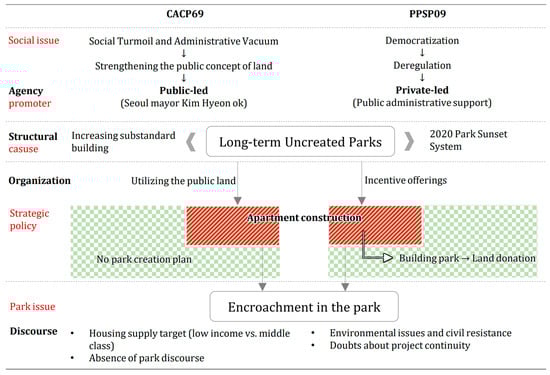 This study investigates the institutional dynamics behind the phenomenon of apartment construction within urban parks in South Korea, using the Policy Arrangement Approach (PAA) as an analytical framework. By comparing two landmark policies—the Citizens Apartments Construction Project (CACP69) of 1969 and the Private Park Special Project (PPSP09) initiated in 2009—it will reveal how park erosion has been legitimized through shifting governance structures, legal mechanisms, and discursive strategies. CACP69 emerged under authoritarian rule to address housing shortages, leveraging public authority to repurpose park land. In contrast, PPSP09 reflects neoliberal tendencies, incentivizing private capital to develop unexecuted park sites amid looming sunset clauses. Both cases illustrate how the long-term neglect of park creation and ambiguous legal definitions have enabled the commodification of public green spaces. The study argues that park management policies in Korea have been shaped by a property-rights-oriented logic, sidelining community participation and ecological integrity. These findings offer critical insights into the intersection of urban planning, environmental governance, and the privatization of public space.