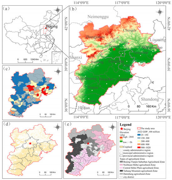 Location of the study area. ((a) Map of administrative divisions of China and the study area; (b) Topography and geomorphology map of the study area; (c) Map of GDP distribution; (d) Map of agricultural land distribution; (e) Map of agricultural zoning.)