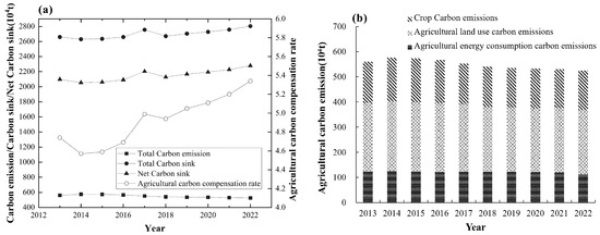 Current Status of Agricultural Carbon Balance. ((a) Carbon emission/Carbon sink/Net Carbon sink; (b) Agricultural carbon emission structure.)
