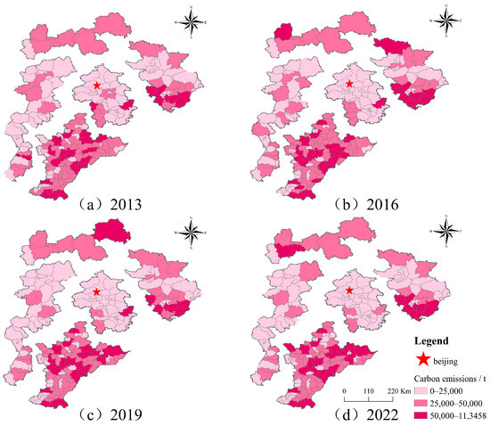 This study calculated agricultural carbon emissions, carbon sinks, net carbon sinks, and carbon compensation rates on the basis of agricultural data from counties in the Beijing–Tianjin–Hebei region from 2013–2022 (Figure 3).