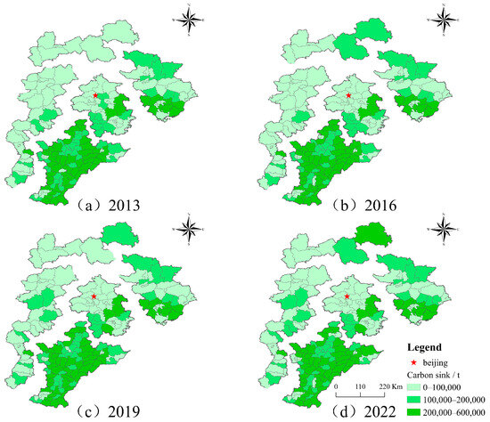 The agricultural carbon sinks in BTH exhibited a pattern of “high in the southeast and low in the northwest”, which is consistent with the distribution of agricultural land and crop yield gradients. The III and II Zones are the core carbon sink areas, followed by the I Zone, whereas the IV and V Zones have the lowest carbon sink levels (Figure 5). From 2013–2022, counties with higher carbon sink levels (≥1 × 104 t) showed an increasing trend, whereas areas with levels below 1 × 104 t continued to decrease, resulting in a steady increase in the total agricultural carbon sink across the region.