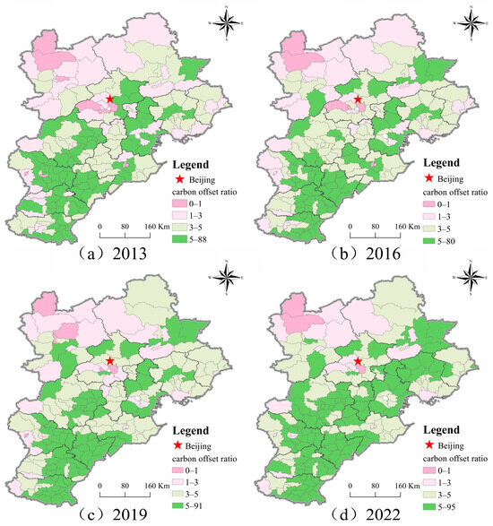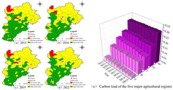 Low-carbon load areas are located primarily in the Taihang Mountain region of northwestern China and certain urban districts (Figure 8a–d): the former region has a cool climate and infertile soil, resulting in high input and low output, with net carbon emissions per unit of output tending toward zero or negative; the latter region has fragmented farmland and a limited scale, with relatively high yields but total carbon sinks below carbon emissions, resulting in overall low carbon loads. The moderate carbon load regions are located primarily in the northern part of BTH (e.g., Zones I, II, and V) and certain western counties of IV. Owing to climatic factors, the carbon sink coverage per unit of agricultural product output is slightly greater than the carbon emissions. High-carbon load regions are concentrated in the central and southern parts of BTH, including Zones IV and III, and the southeastern part of region I. Through low-carbon policies, large-scale planting, and technological interventions, the carbon sink per unit of agricultural products is significantly greater than the carbon emissions.