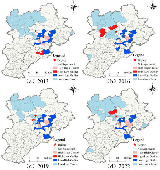 The LISA clustering analysis indicates that counties in Tianjin and its surrounding areas with well-developed facility agriculture are predominantly classified into high-high and low-high clusters, leveraging the advantages of urban agriculture to form a high-carbon compensation model; the low-high clusters are driven by technological spillover and policy incentives from Beijing and Tianjin and are undergoing a low-carbon transition (Figure 7). Low-low clusters are primarily found in ecologically fragile regions such as Zhangjiakou, where weak carbon sequestration and difficult carbon control due to climate and terrain factors result in an “ecological fragility-low carbon compensation efficiency” lock-in effect, highlighting spatial differentiation. From 2013 to 2019, the count of “high-high” cluster regions grew, indicating an outward spread of high carbon compensation models. Concurrently, “low-low” cluster regions diminished, with areas like Zhangjiakou experiencing enhanced carbon compensation rates, leading to a mitigation of spatial disparities. By 2022, regional disparities in agricultural carbon compensation rates widened once more, significantly impacted by the COVID-19 pandemic. Differences in agricultural endowments and structures influence carbon compensation capabilities, and balanced development hinges on accurately recognizing regional characteristics.