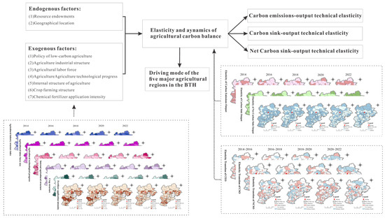 The IPCC’s Sixth Assessment Report indicates a significant rise in global average surface temperature over the past few decades [1], with climate change emerging as a critical issue threatening human survival and development [2]. To adhere to the 2 °C temperature control limit, nations are compelled to accelerate emission reductions [3]. China actively participates in global climate governance and proposed the “dual carbon” goals (carbon peaking and carbon neutrality) in September 2020 [4], providing a direction for domestic low-carbon development. As a foundational industry of the national economy, agriculture not only fulfills core functions in ensuring people’s livelihoods, maintaining social stability, and driving economic operations but also faces ecological challenges such as high total carbon emissions, weak carbon sink capacity, resource scarcity, declining soil quality, and pollution. Unlike industry, agriculture possesses a dual characteristic of being both a “carbon source” and a “carbon sink” [5]. On the one hand, agricultural production activities and crop cultivation processes generate carbon emissions. On the other hand, the photosynthesis of crops and the accumulation of soil organic matter can form carbon sinks. The dynamic balance between these two directly impacts the carbon metabolism efficiency of regional agriculture. Optimizing the carbon source–carbon sink matching relationship can enhance agricultural carbon balance potential [6]. Techniques like returning straw to the field and replacing chemical fertilizers with organic fertilizers have significantly improved the agricultural carbon sink capacity [7]. The effectiveness of their regulation is directly linked to the efficiency of achieving the “dual carbon” goals, making it a crucial breakthrough point in the global carbon neutrality process. Despite the remarkable achievements in Chinese agriculture since the reform and opening-up periods, the demand for low-carbon transformation under ecological constraints has become increasingly urgent. Among these, the BTH region, as a pilot zone for ecological civilization construction and a core agricultural area in the North China Plain, faces both the pressure of agricultural transformation under the coordinated development strategy and the constraints of low-carbon targets. Therefore, research into the evolutionary patterns and elastic mechanisms of its agricultural carbon balance holds significant exemplary value [8,9].