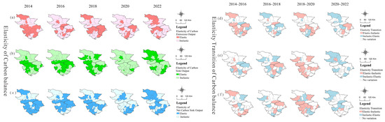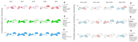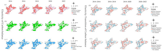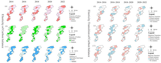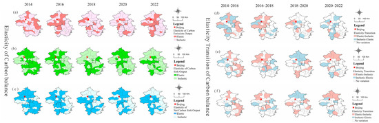 Elasticity and Changes in Agricultural Carbon Balance in the Beijing–Tianjin–Hebei region. ((a) the elasticity of carbon emission output technology; (b) the elasticity of carbon sink output technology, (c) the elasticity of net carbon output; (d) the elasticity transition of carbon emission output technology; (e) the elasticity transition of carbon sink output technology; (f) the elasticity transition of net carbon output.)