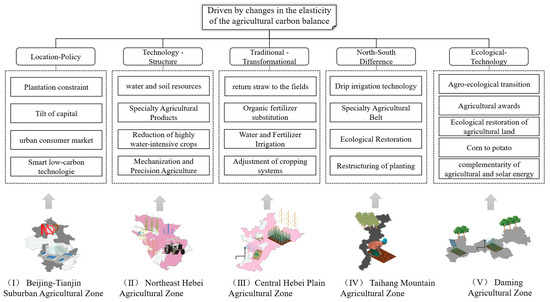 The spatial differences in agricultural carbon balance elasticity in BTH are formed by the combined effects of endogenous and exogenous factors (Figure 9). Endogenous factors include agricultural resource endowments and geographical location; exogenous factors include crop structure, technology input, and agricultural policy support, which indirectly affect carbon balance elasticity by shaping resource utilization conditions.