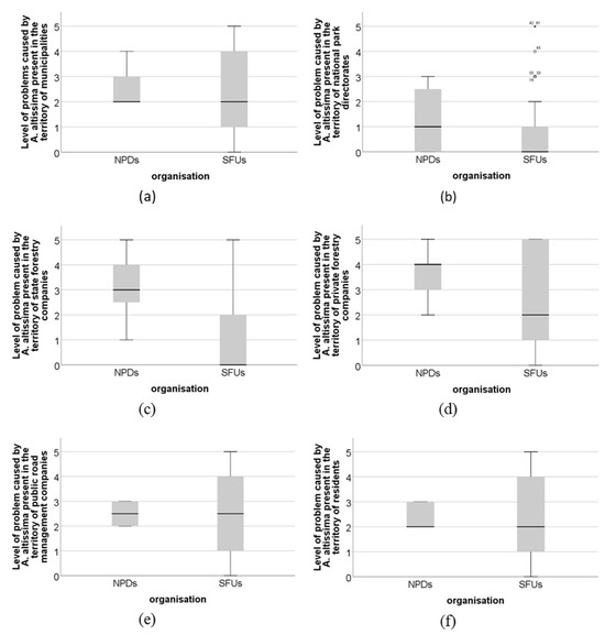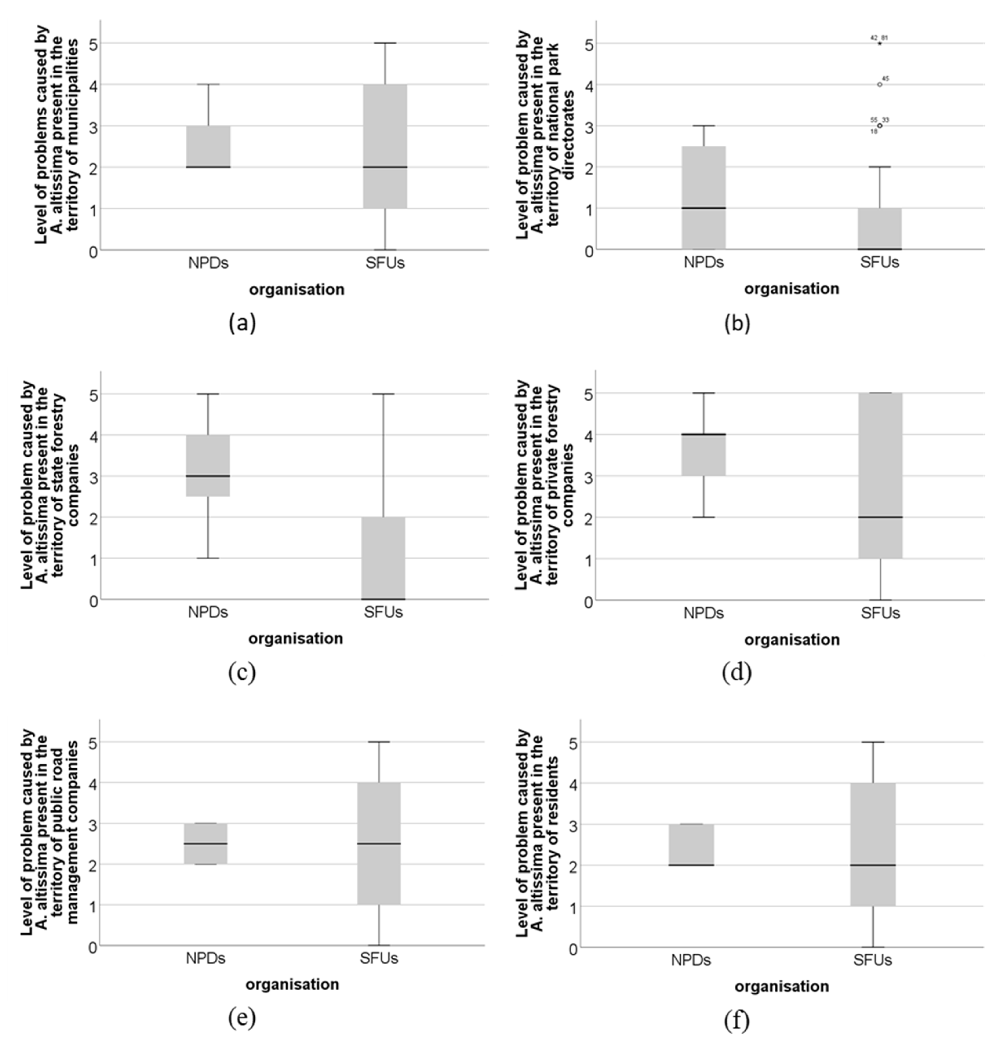 A. altissima in the territory of different stakeholder groups caused a problem to a variable degree for our two respondent groups. We measured the extent of the problem on a Likert scale (0–5: 0, not a problem at al;, 5: a major problem). The medians of the answers show that for NPDs, the presence of the species on the territory of private and state forestry companies seemed to cause the largest problem, while for SFUs, the species present on the territory of the public road management companies was the most problematic. Based on the Mann–Whitney U test, only the problem regarding the state forestry companies showed a significant difference (