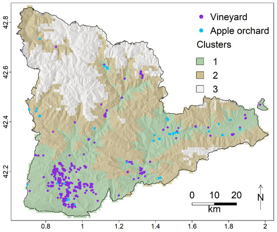 Cluster map classifying the three different regions according to climate. Dots represent existing plantations (2022) for vineyards (purple) and apple orchards (blue).