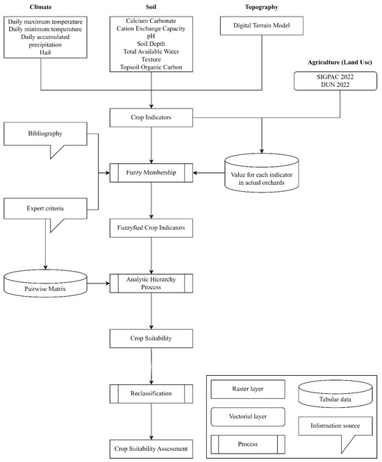 Several studies have assessed land suitability from different perspectives [28,29,30,31,32,33,34,35,36,37,38,39,40,41,42,43]; however, very few have focused on mountainous regions, and none have incorporated highly influential features such as FRls or FRea (see Table S1 of Supplementary Material) or combined methodologies within their approach. In this study, we developed a suitability assessment approach designed to integrate diverse variables across multiple scales. The relationship between each indicator and cultivation suitability was established using gradual, continuous functions (fuzzy membership functions) specifically defined for each variable. This procedure allowed us to represent nonlinear responses and thresholds, avoiding abrupt transitions inherent in Boolean classifications. By doing so, it captures the inherent complexity and variability of the indicators included [55]. Furthermore, it enhances the sensitivity and explanatory power of indicators, enabling more realistic evaluations of suitability [56,57]. The posterior use of AHP proved to be an appropriate and efficient choice, as it enabled a structured quantification of expert knowledge and facilitated the comparison of heterogeneous variables influencing crop suitability. Altogether, the approach is easily adjustable to different agro-climatic and socio-economic contexts if used hand in hand with the knowledge of sector experts and farmers. Its structure and input can also be readily modified to reflect local suitability conditions. For these reasons, we consider it applicable to climate change scenarios and the exploration of new cultivable areas. The suitability assessment approach (Figure 3) relied on a multi-criteria analysis that included the following: (i) gathering data and the determination of a spatial resolution to work with; (ii) the selection of the most relevant indicators to assess crop suitability derived from the data; (iii) the definition of fuzzy membership functions for each indicator; (iv) the weighting of the main groups and indicators inside each of the main groups; and (v) the overlaying of all the layers to obtain a final suitability map. This approach to crop suitability modeling enables a more valuable and informative grading of land suitability than those derived from a Boolean approach.