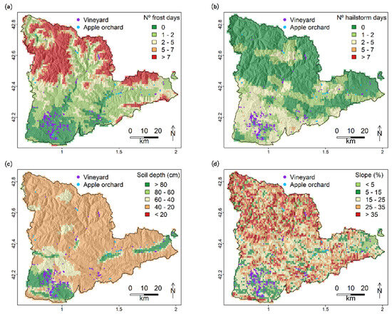 Overall, both crops were primarily influenced by climatic conditions; however, vineyards were more responsive to hydric needs, frosts risk during late spring and solar radiation, while apple orchards were more dependent on hailstorm risk, frost risk during late spring and slope.