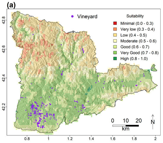 These contextual factors strongly influenced the selection of the suitability assessment approach used in this study, over other data-driven multi-criteria analysis like machine-learning algorithms. MaxEnt [86], for example, is a widely used model. Moreover, it has been applied to crop suitability area delimitation [70,87] and specifically for vineyards [44] and apple [45]. Although its demonstrated applicability in assessing suitability, in the specific case of mountainous regions, the scarcity of representative and robust datasets will usually not provide a good baseline for applying machine-learning methods. Consequently, the fuzzy membership method combined with the AHP was considered the most appropriate method for this study, offering both methodological consistency and practical adaptability to the specific conditions of mountainous agricultural systems.