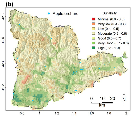 Suitability maps for vineyards (a) and apple orchards (b) as obtained by the weighed combination of rasters for each indicator and crop.