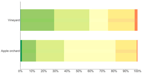 The percentage for each class is reported in Figure 5. Some indicators showed a high suitability for both crops (75%), such as SHDr, pH, NHN, CEC, and TOC. In addition, Te showed a high suitability for vineyards and Ha for apple orchards. On the other hand, there were a few indicators with a more restrictive distribution. Slope, for example, negatively weighted between 50–75% of the territory. A similar pattern can be seen for TAW, GST, BBL, CDls, and GSR. For grapevine, FRls exhibited a more suitability distribution; however, for apple, FRls exhibited very low values overall (70% of the area with less than 0.3). This change was due to the temporal window of the indicator, i.e., it was earlier for apples than grapevines, which involved a higher probability of frost days (Table S1 of the Supplementary Material). SD and TAW, although not having values between 0–0.2, most of them didn’t exceed the 0.5 threshold (occupying these values 85–70% of the whole study area).