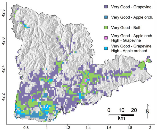 Suitability evaluation for vineyards and apple orchards (Figure 6 and Figure 7) resulted in around 1401 (0.2%) and 7704 ha (1.3%) of highly suitable land, respectively. Following this classification, in descending order, very good suitable plots represented around 168,167 (28.6%) and 70,530 (12.0%) ha, respectively; good suitable classes around 176,461 (30.0%) and 141,052 (24.0%) ha, respectively; moderate around 93,922 (16.0%) and 258,360 (43.9%) ha, respectively; low around 133,620 (22.7%) and 106,425 (18.1%) ha, respectively; very low around 14,402 (2.4%) and 3902 (0.6%) ha, respectively; and minimal was not defined in any pixel over the whole area.