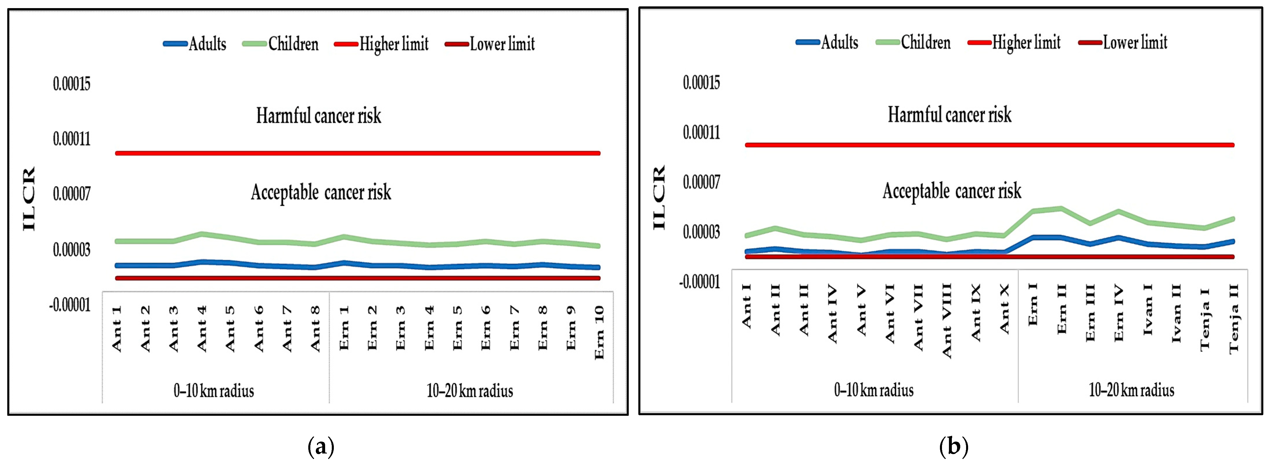 | CRi/ILCR > 1 × 10−4 | Harmful cancerogenic risk |