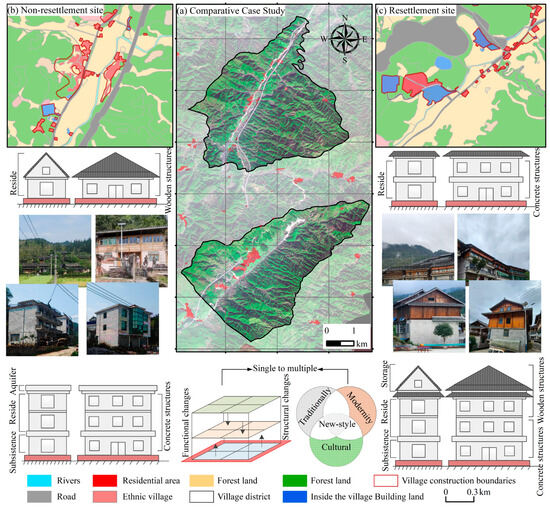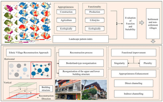 Under the relocation policy, ethnic villages face both diversified opportunities and significant challenges, making it crucial for them to adapt to evolving development conditions. Investigating the characteristics, processes, and effectiveness of village reconstruction in response to external stimuli is critical to supporting their long-term progress. This study evaluates the functional and suitability levels of ethnic villages to determine their comprehensive development status, identify typical cases, and compare resettlement with non-resettlement villages. These comparative analyses aim to uncover different reconstruction pathways and more scientifically represent the characteristics and effectiveness of the reconstruction process.