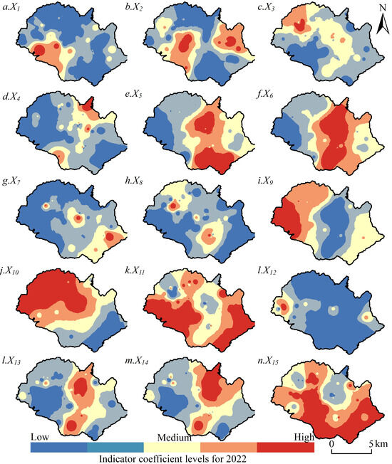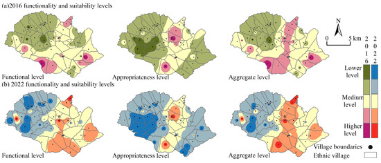 The evaluation indicator systems for the functional stability levels of ethnic villages in 2016 and 2022 were employed to assess changes in functionality and appropriateness (Figure 4 and Figure 5). To ensure comparability across indicators of varying scales, values were standardized using the extreme difference method. The entropy weighting method was then employed to objectively assign indicator weights. These weighted indicators were used to calculate the overall functionality and appropriateness scores of ethnic villages and to analyze their temporal and spatial evolution.