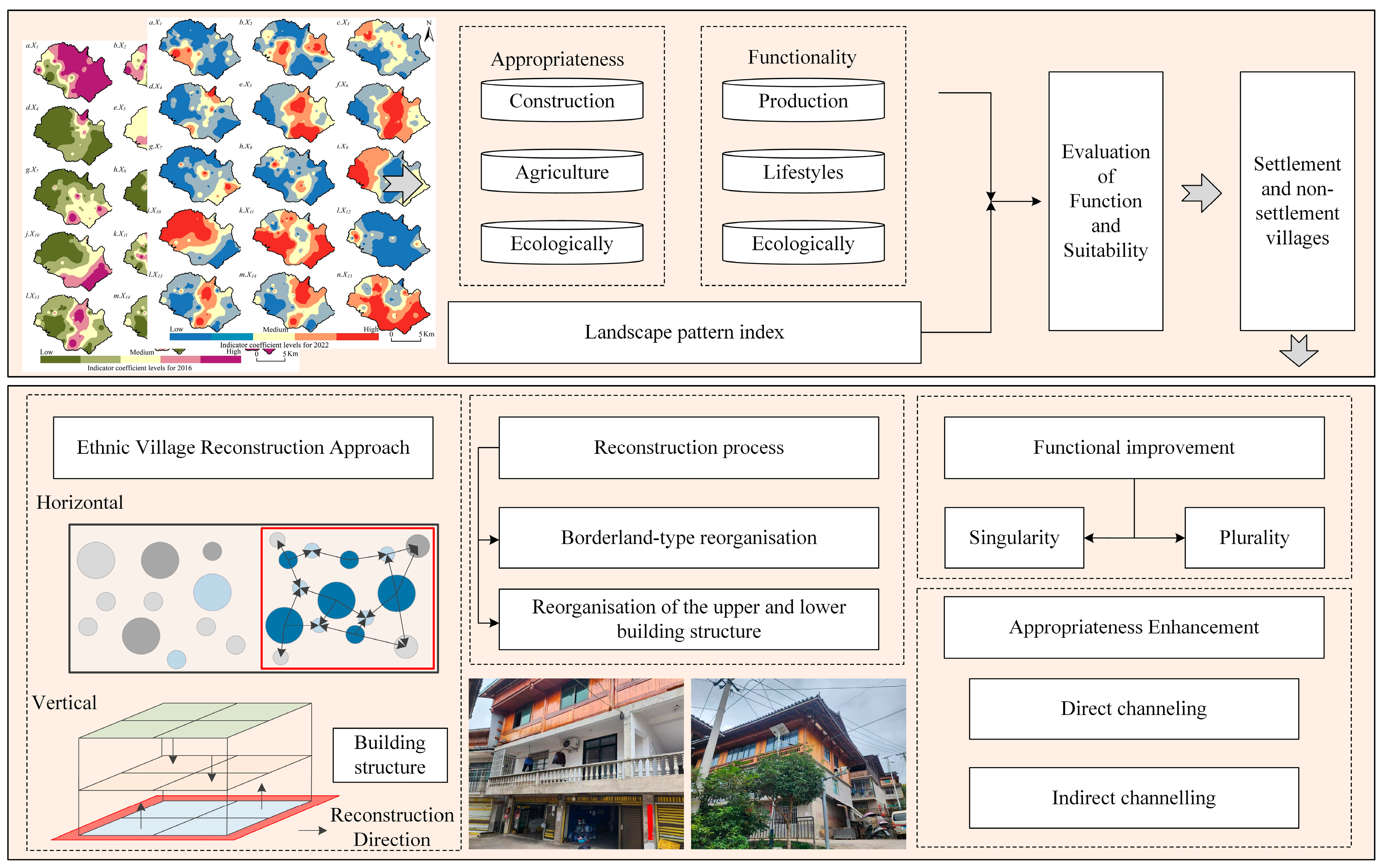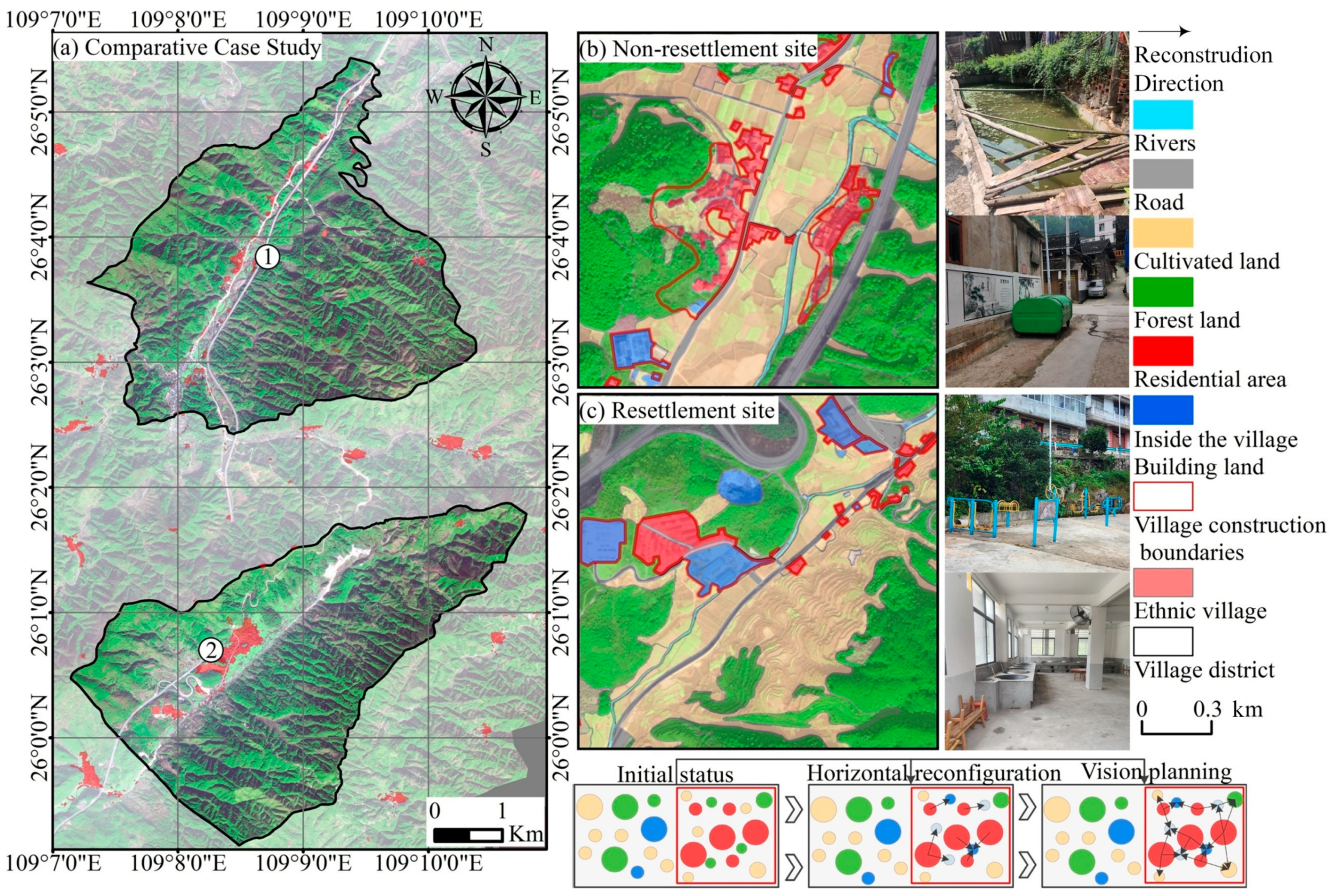 Chen, X.; Yang, F.; Sun, J.; Deng, L.; Luo, J.; Cui, J. Reconstruction of Ethnic Villages Under the Intervention of Relocation: Functional Improvement and Suitability Enhancement: A Case Study of Yongcong Township in Liping County. Land 2025, 14, 2138. https://doi.org/10.3390/land14112138