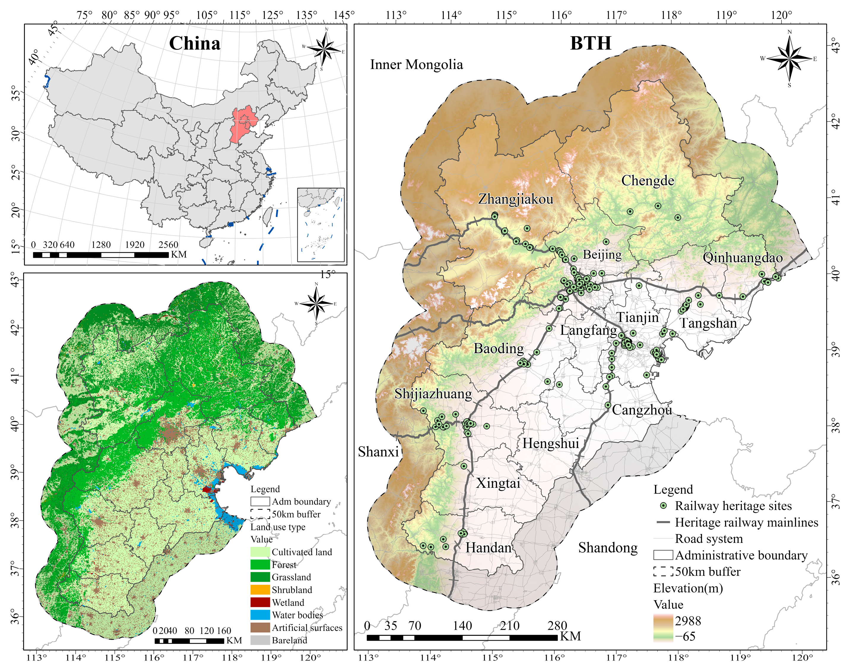 | 1 | Heritage data | Railway heritage sites | Vector data | This study conducted screening and compilation based on industrial heritage inventories published by government departments or research institutions including five national, provincial, and municipal heritage lists (see Table S1 in the Supplementary Materials for detailed URLs). Additionally, the author supplements the data with findings from field investigations, resulting in an integrated railway heritage list for the BTH region, comprising 261 sites. The corresponding geographic coordinates were obtained from Tianditu. |