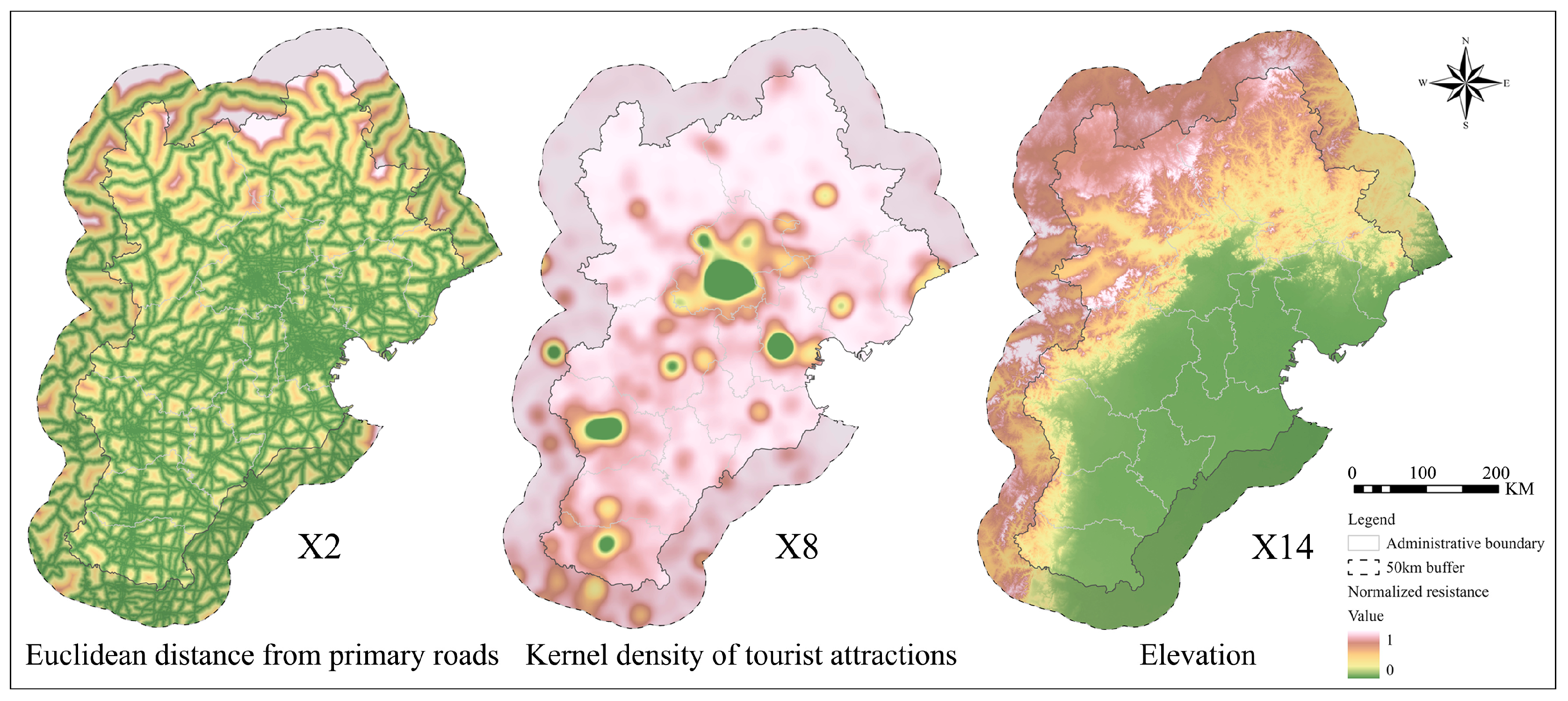 | Public services | X8: Kernel density of tourist attractions (including A-level and higher scenic areas, national key cultural relic protection units, and historical and cultural cities, towns, and villages within BTH) | Natural | 8 | 0.7083 | 0.2114 |