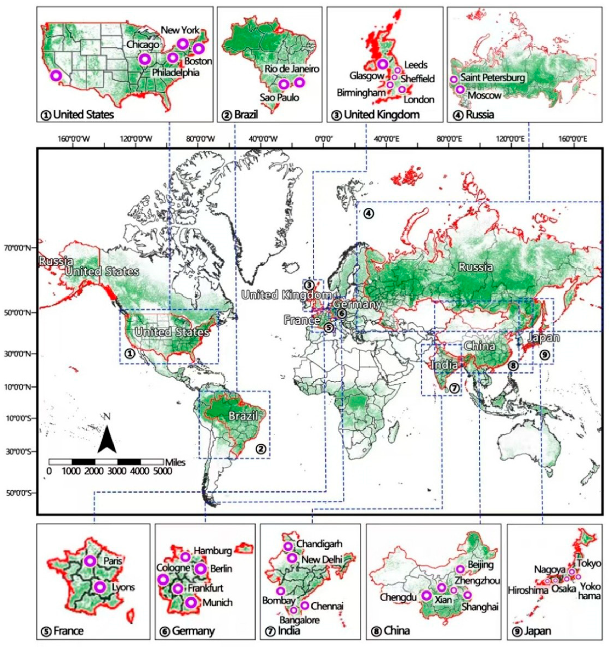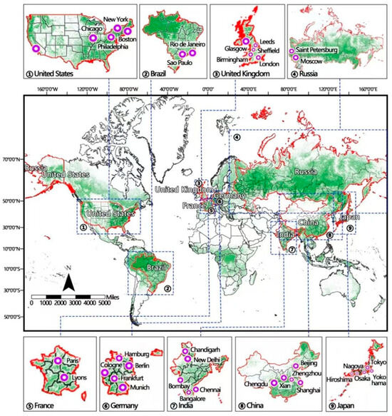 - Derdouri, A.; Murayama, Y.; Morimoto, T.; Wang, R.; Haji Mirza Aghasi, N. Urban green space in transition: A cross-continental perspective from eight Global North and South cities. Landsc. Urban Plan. 2025, 253, 105220. [Google Scholar] [CrossRef]