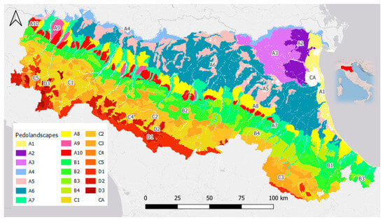 The regional soil map at the scale of 1:1,000,000 [] identifies 22 pedolandscapes (or soil provinces): ten in the alluvial plain and four, five, and three, respectively, in the low (150–450 m a.s.l.), medium (450–900 m a.s.l.), and high (>900 m a.s.l.) Apennines (Figure 1). These pedolandscapes represent distinct geographical units where soil characteristics are relatively uniform, as they develop under a consistent combination of climate, vegetation, and parent material.